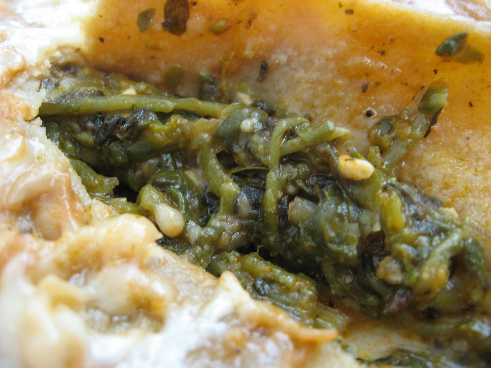 In addition to all this other good stuff, my favorite meals at the restaurant are the spinach enchiladas. They can come with a deeply rich and flavorful red sauce: Cut into, the enchiladas look like this: