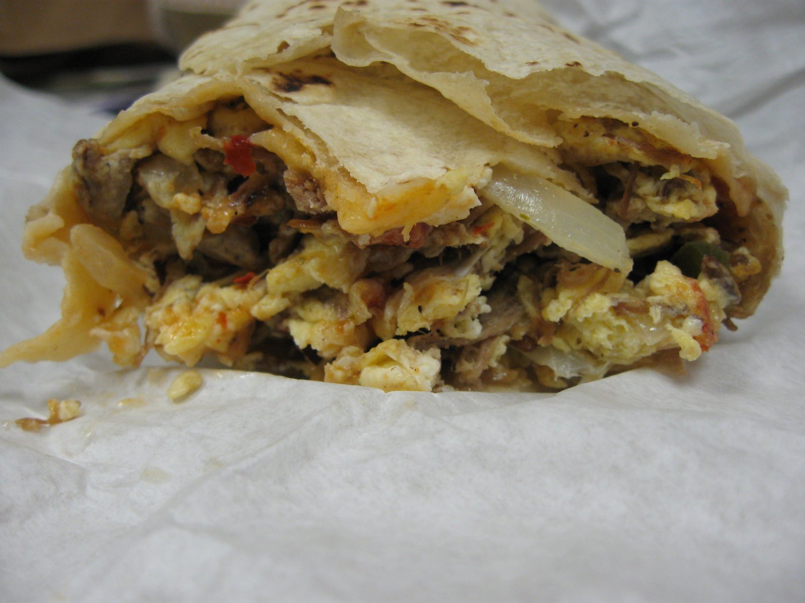 On the other hand, he is sane enough an do the Mexican restaurant standards very well: This is as good a machaca and egg breakfast burrito as I have had in town, no, make that the best I've had anywhere. There was no filler here, just fluffy egg and extremely good beef machaca. Enough onion and green peppers to provide texture and accent notes. I also appreciated that Danny (who was cooking that morning) asked if I wanted the salsa put inside. Of course I did; I can't roll a burrito as well as he and I definitely want some of his salsa.