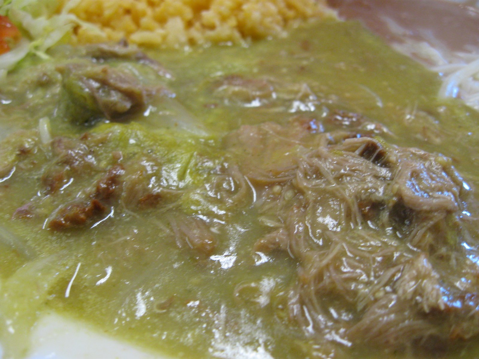 Likewise, the chile verde (green chile) here is perfectly balanced and deeply flavorful, if a bit expensive for the portion size. The pork (sometimes beef is available also) is cooked until it shreds and becomes completely permeated with green chile and touches of tomatillo flavor. As good as it gets: