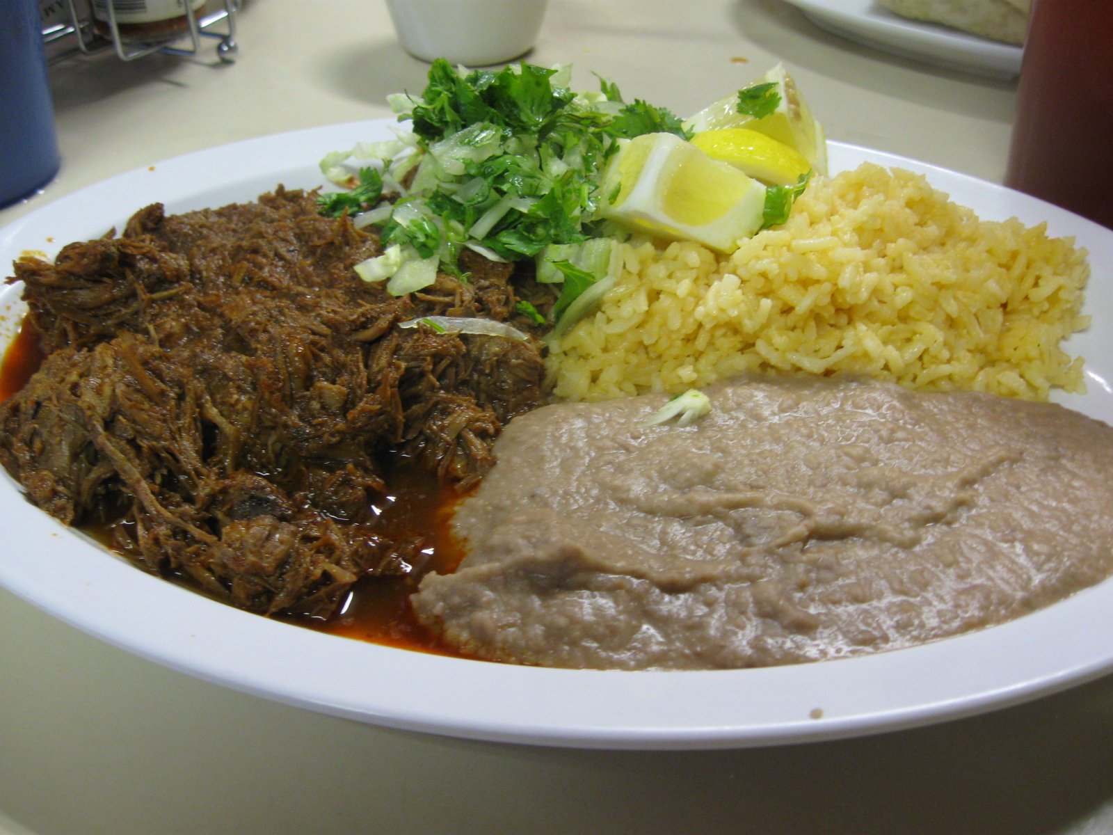 Recently I got lucky and stopped in on a day when barbacoa was the special. One could get it in a burrito, in a sandwich, as a taco plate, or as a complete barbacoa plate, which looked like this: Along with his standard rice and his frijoles (no lard), this is the best barbacoa (imho) in Yuma. As with many of his other dishes, the meat had been cooked to shreds, so that each shard of meat was full of flavor. In some ways this pot roasted beef shoulder was much like my grandmother's pot roast with the deep flavor of long cooked beef. But unlike anything my grandmother would have prepared, the main flavoring here was mild dark dried red chile with a touch of citrusy tang .