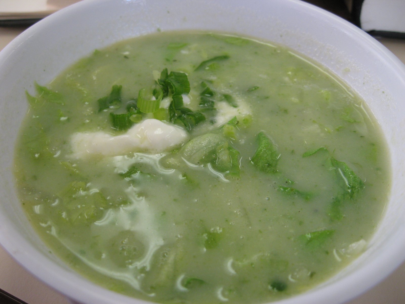 So I got this little cup of soup: It was amazingly good. The the rich and flavorful chicken stock had been slightly thickened, fresh crunchy shredded lettuce and diced green onion had been stirred in, and a dollop of sour cream had been added. A perfect little soup, the sort of dish that would've fit in a multicourse tasting menu.