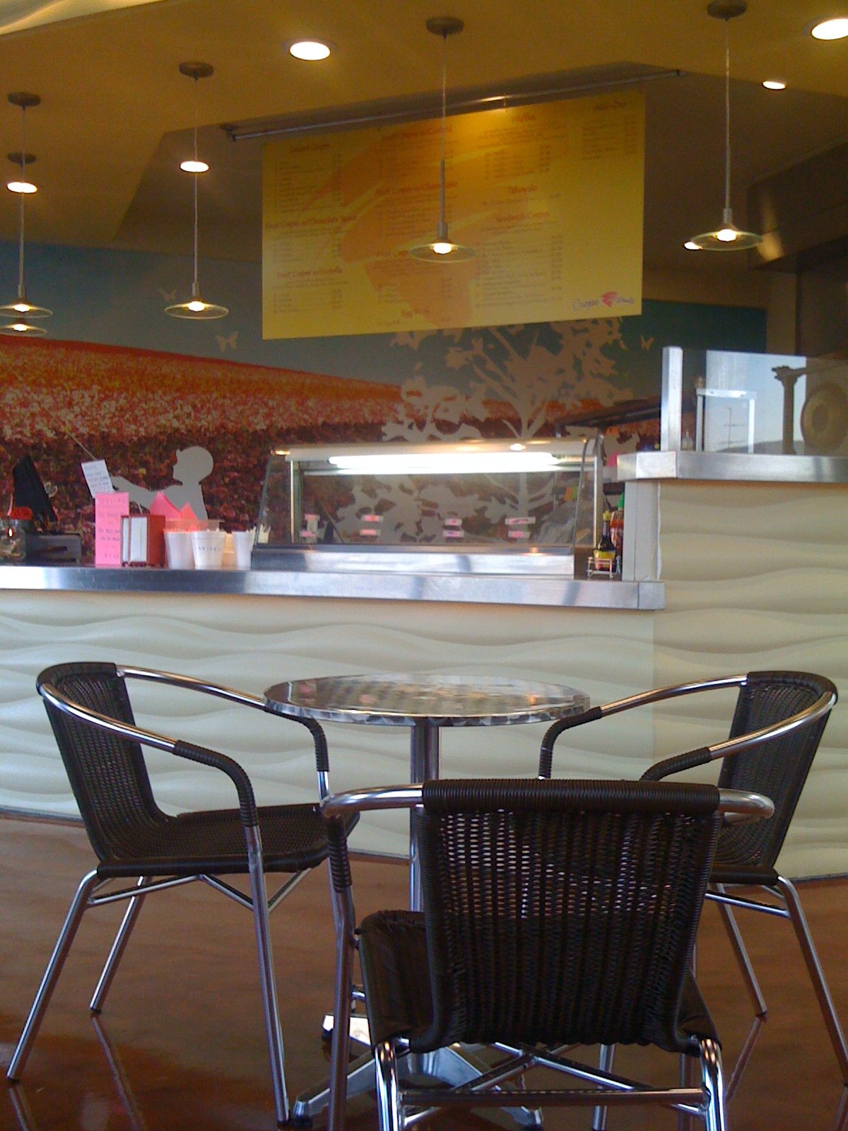 When we were done, we walked out and wanted dessert. We thought about Yogurt World and Tapioca Heaven, but this new building is closer when you walk across the street. Crepe World. (The Nice Young Lady who waited on us was wearing a Yogurt World t-shirt; I did not ask if they were owned by the same people)It is right on Convoy, so you don't have to encounter what I like to call the 'parking lot from Hell'. It was not crowded. As in, we were the only people there, our order number was 13 and it was 6:41 in the evening…I think this was the second day of it opening.