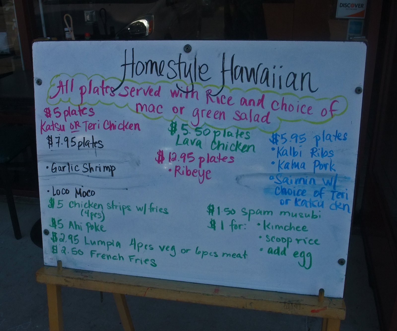 The old signage is still up, but a banner had been placed on the awning. It read "Homestyle Hawaiian", so I guess I was here? A folding grease pencil board was up in front of the entrance, and in the classic "Mo's" style all the offerings for the day were listed.