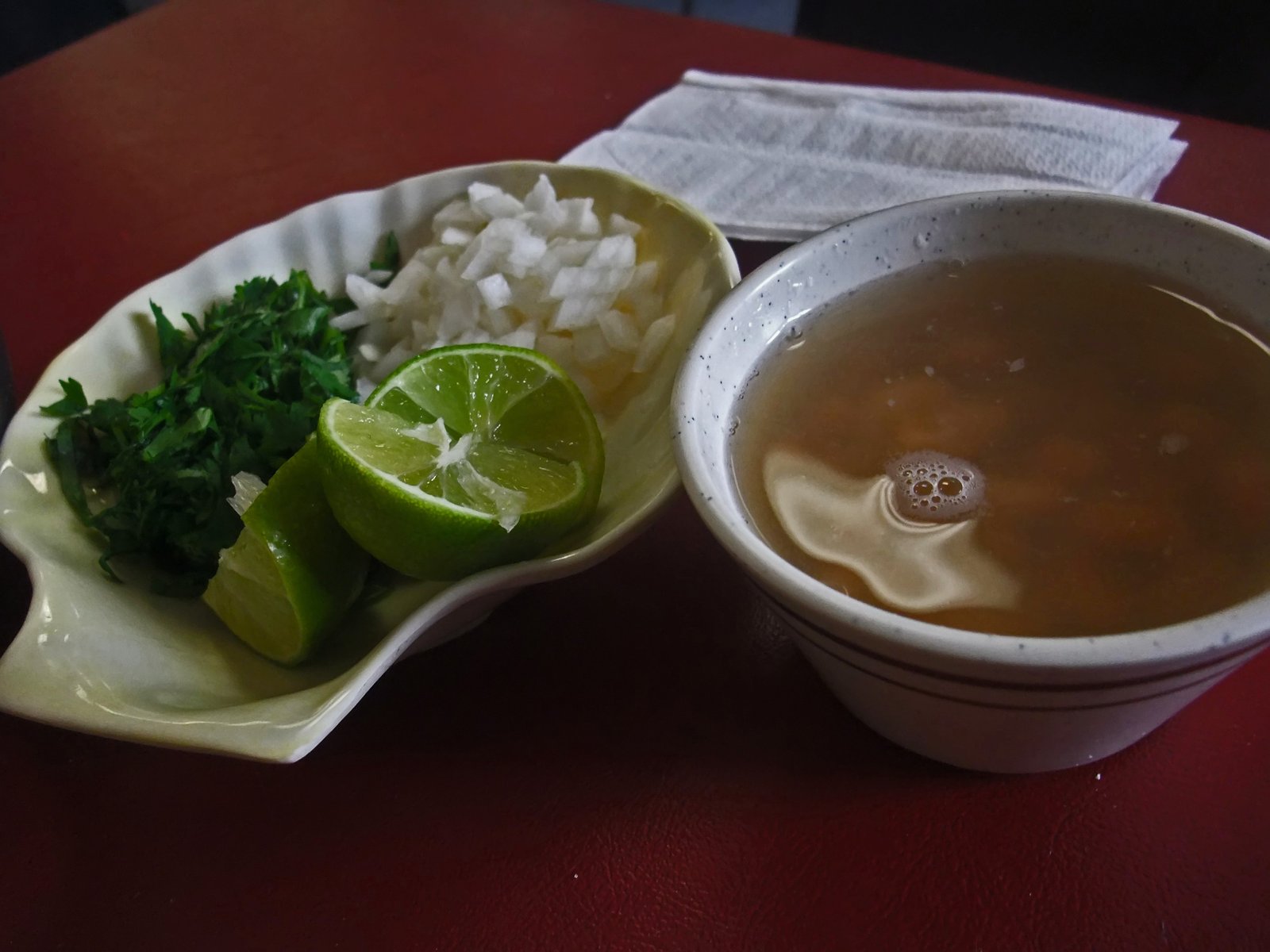 Of course the Birria arrived with all the usual accompaniments. The tortillas were routine, but nice and hot. Onions, cilantro, and lime are a must. The beans were terribly bland though.