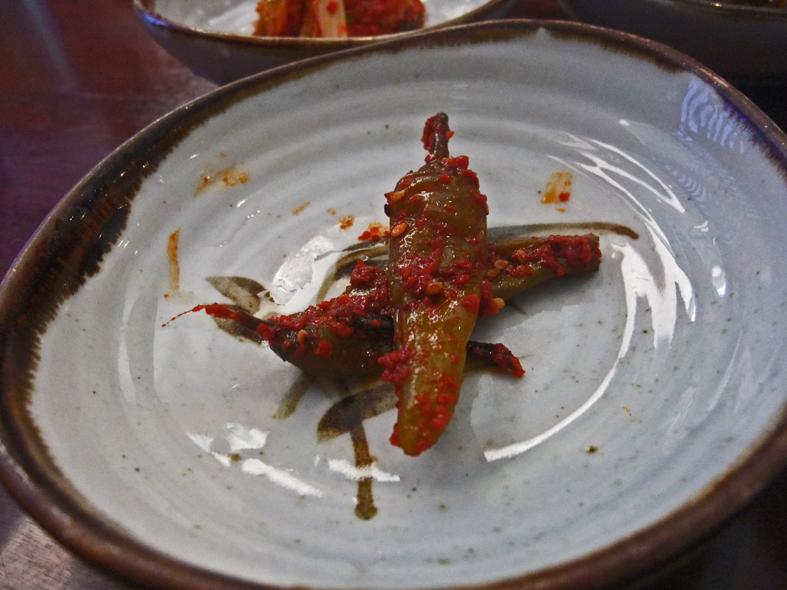 The panchan varies on each visit, so I won't go into each item. I will say that you'll probably find something you enjoy. We did notice that the panchan is on the salty side. One of our favorites is the Sesame Leaf (Kaennip – Perilla) panchan: