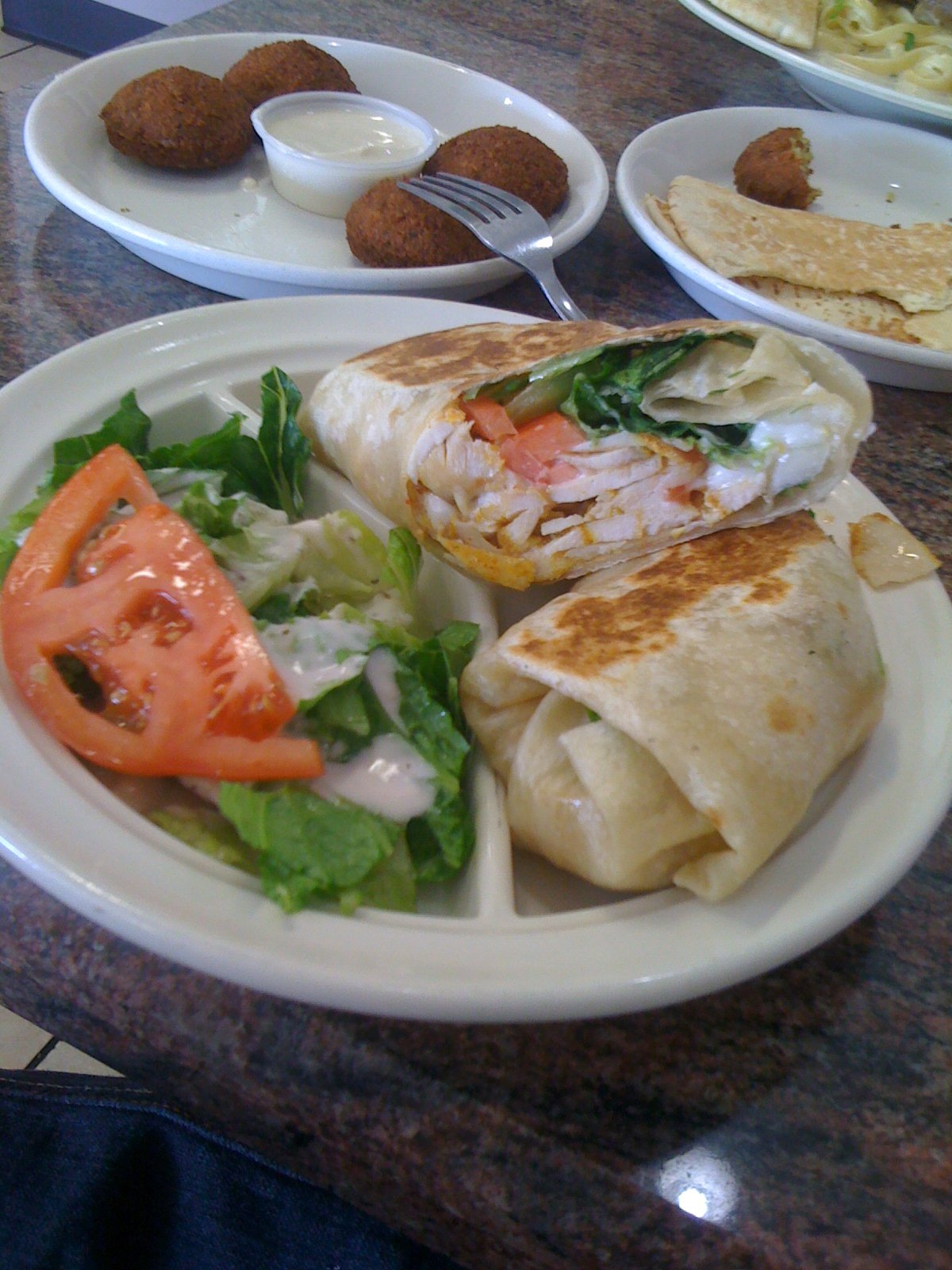 009Of course, they serve Shawarma ($4.95).  This one is carved fresh off the spit chicken with lettuce, tomato, onion and a pickle with fresh tahina sauce wrapped in warm fresh flatbread. It is served with a small salad (and very large tomato half…)