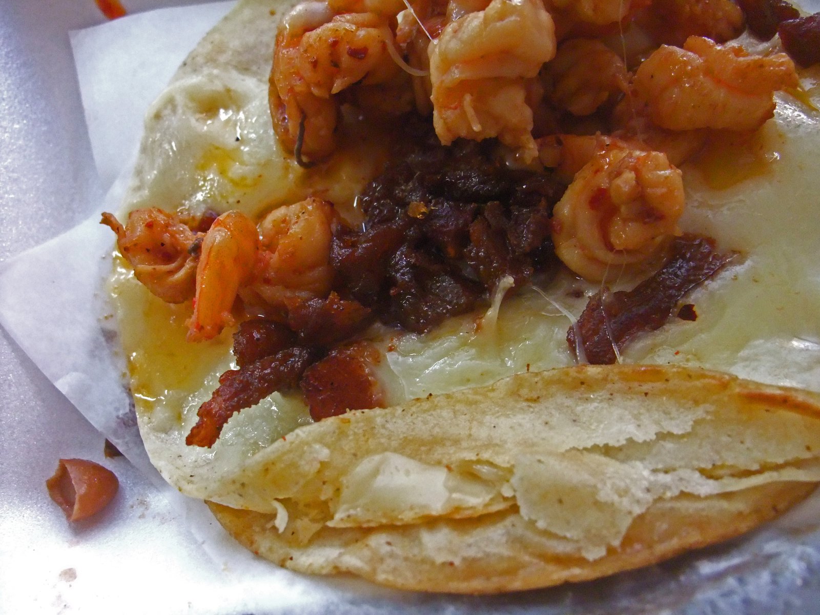 This one came with doubled flour tortillas prepared much in the manner as the other taco. It was chocked full of nice, plump shrimp, prepared in a mild tomato based sauce. As good as the shrimp were, it was the stuff on the bottom that made this taco…… it was chiccharon, pork that had been deep fried to a crisp. Very nice…..