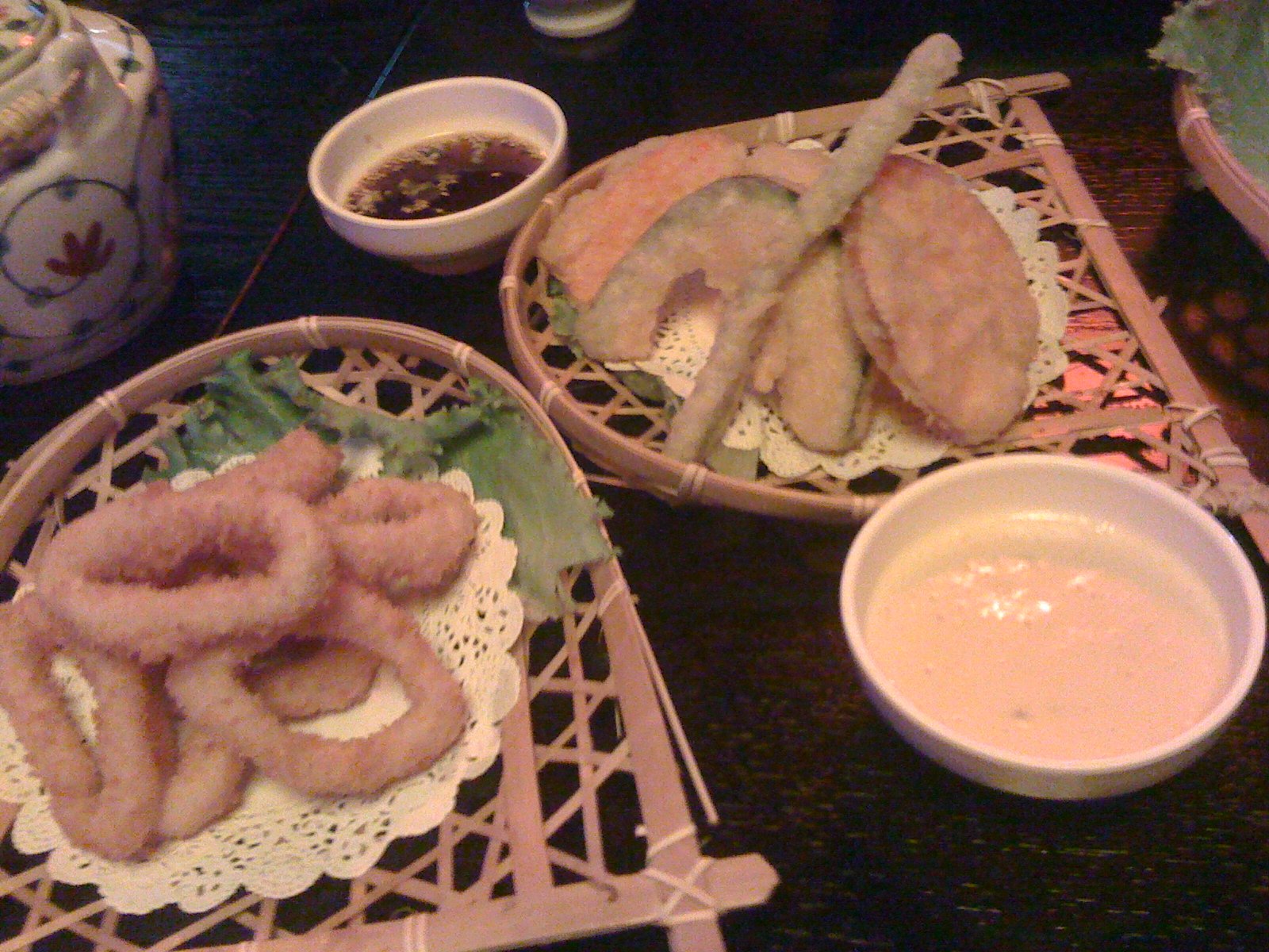 On the right, the mixed tempura vegetables (one each of onion, broccoli, squash, sweet potato, carrot and green bean)($3.95)- it was listed as vegetable pancakes on the menu and was shredded in that photo, but this was fresh vegetables and again, lightly battered and fried properly…not greasy. It was served with the homemade mayonnaise dipping sauce in front. Light and lemony.