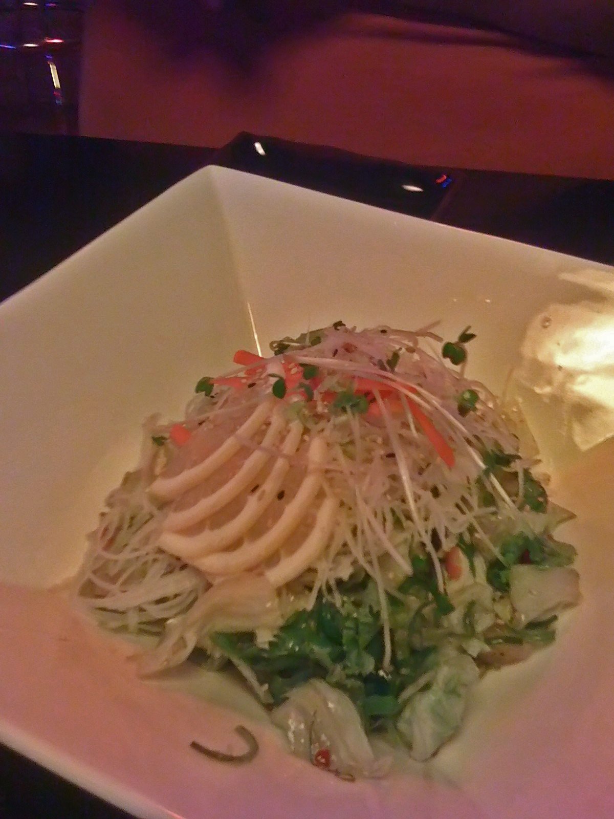 First, the seaweed sashimi salad ($12). Assorted, randomly cut sashimi pieces – a lot-, seaweed salad, baby lettuces, shredded daikon topped with a lemony/sesame oil/slight wasabi flavor dressing. There was a lot of sashimi-tuna, yellowtail, salmon, red snapper and albacore and a lot of lettuce. We started and ended our meal with this salad…