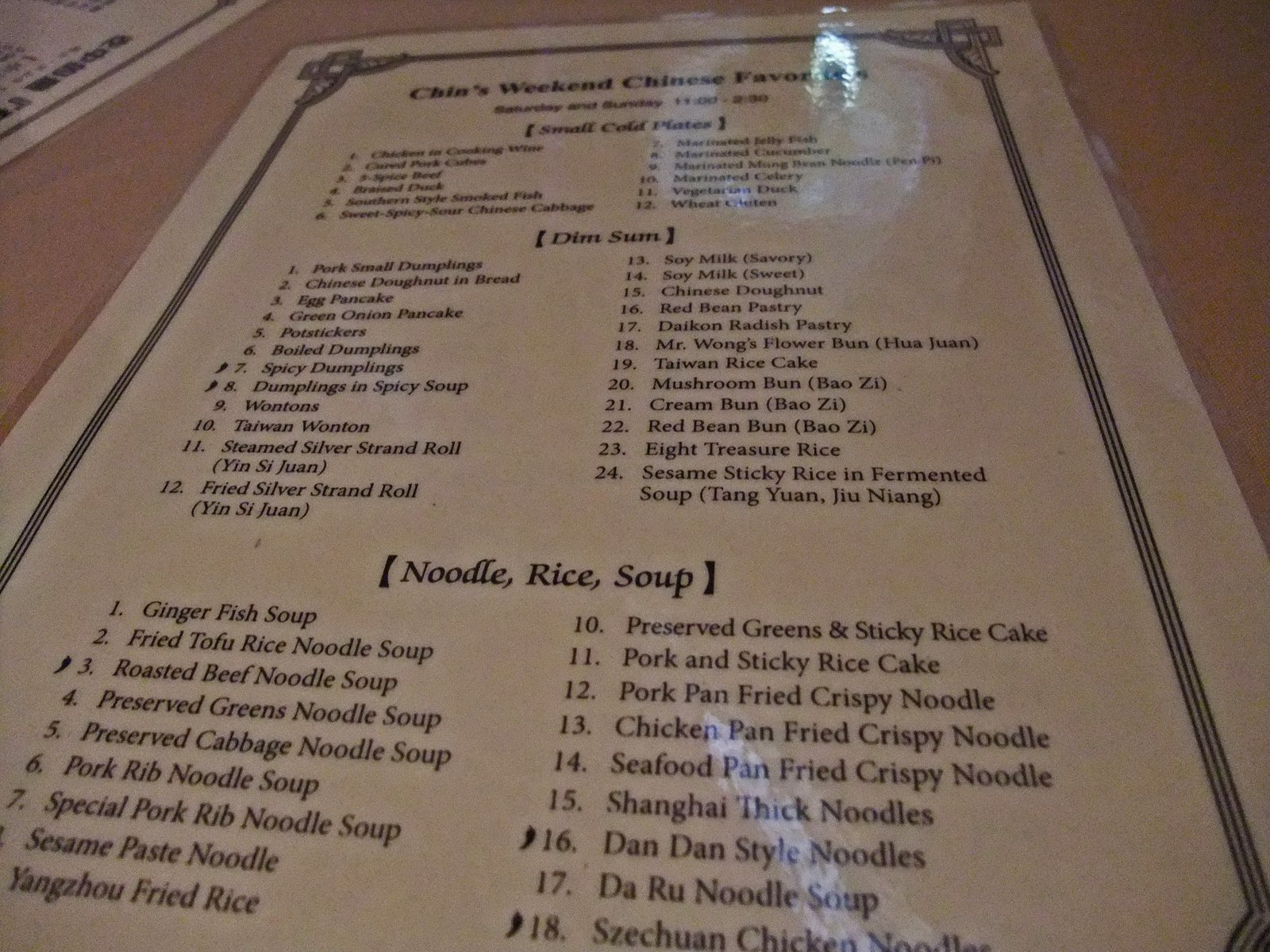 Chinese breakfast served 930 am to 2pm Saturdays and Sundays.