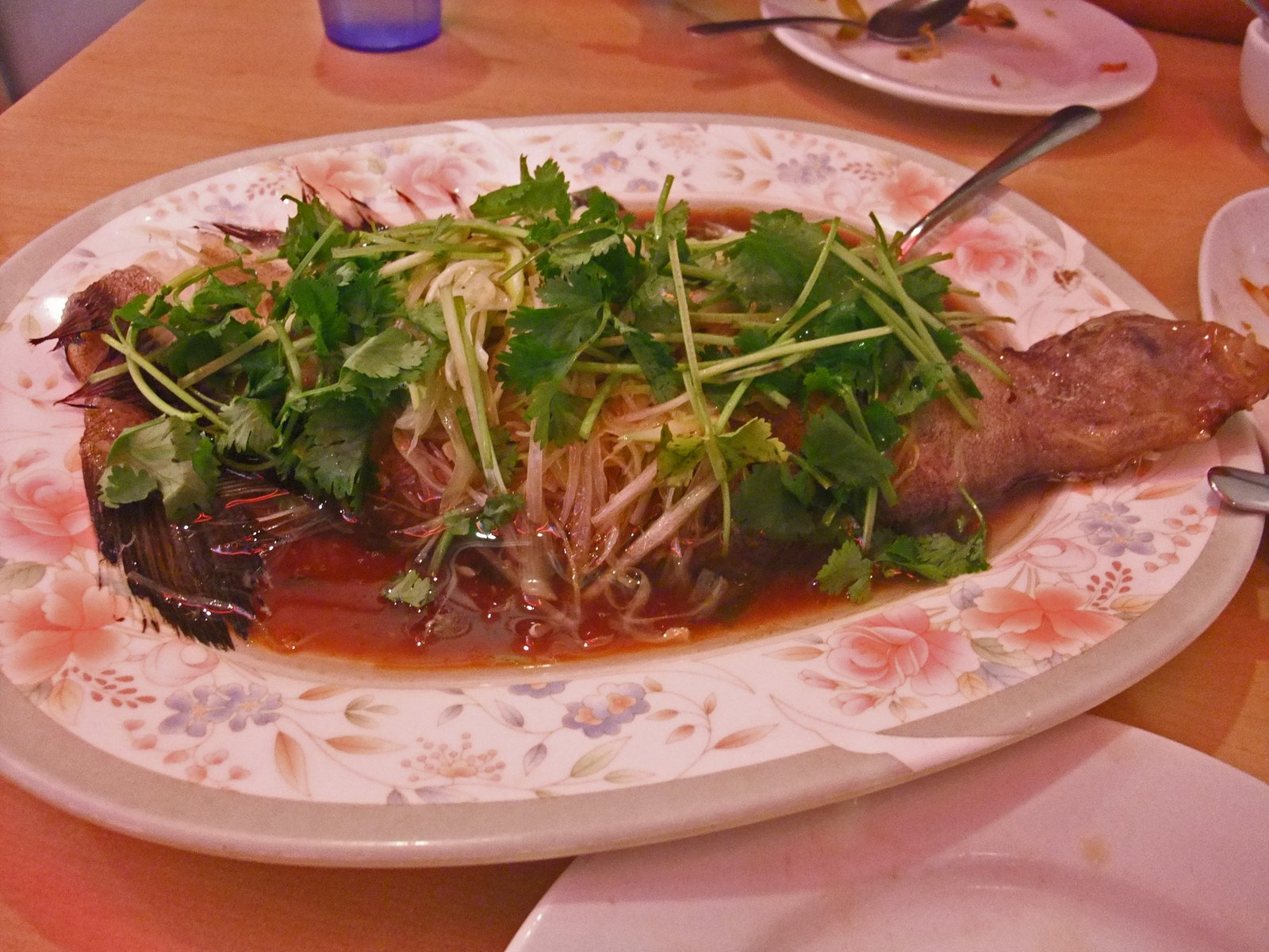 First off, apparently the oil used to top the fish had not been heated properly, and so there was no sizzle, nor wisp of steam coming off this. Thus, this caused the dish to have an excessively greasey feel to it. Also, the soy sauce was not appropriately flavored, and didn't add enough flavor. And worst of all, the oil tasted rancid…….yuck. My tongue was coated with a nasty rancidness that was really difficult to conquer. To add insult to injury, the Missus got a fish bone stuck in Her throat after the very first bite. I don't think we'll forget this dish for a while….for all the wrong reasons….