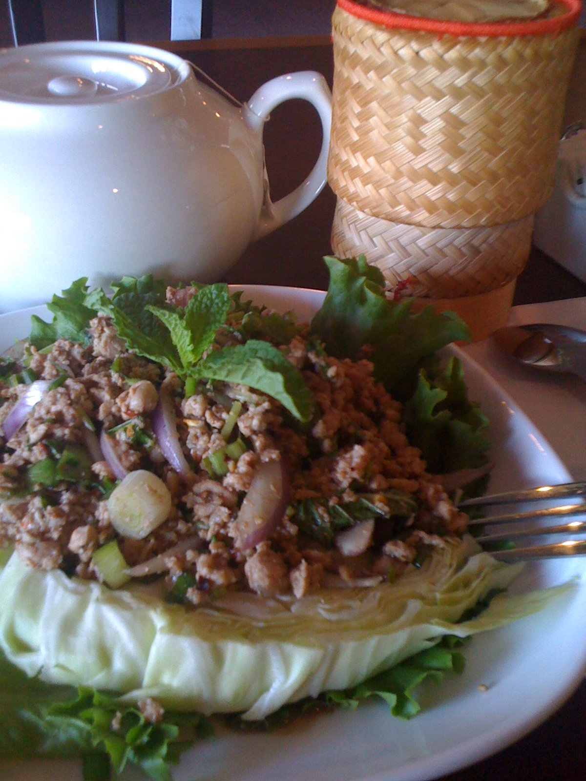 Pork Larb ($7.95), hot tea, sticky rice ($2.25). I got this on opening day. Kobe and the crew greeted me so warmly and it was very nice. The larb, of course, was excellent and really satisfied my cravings.