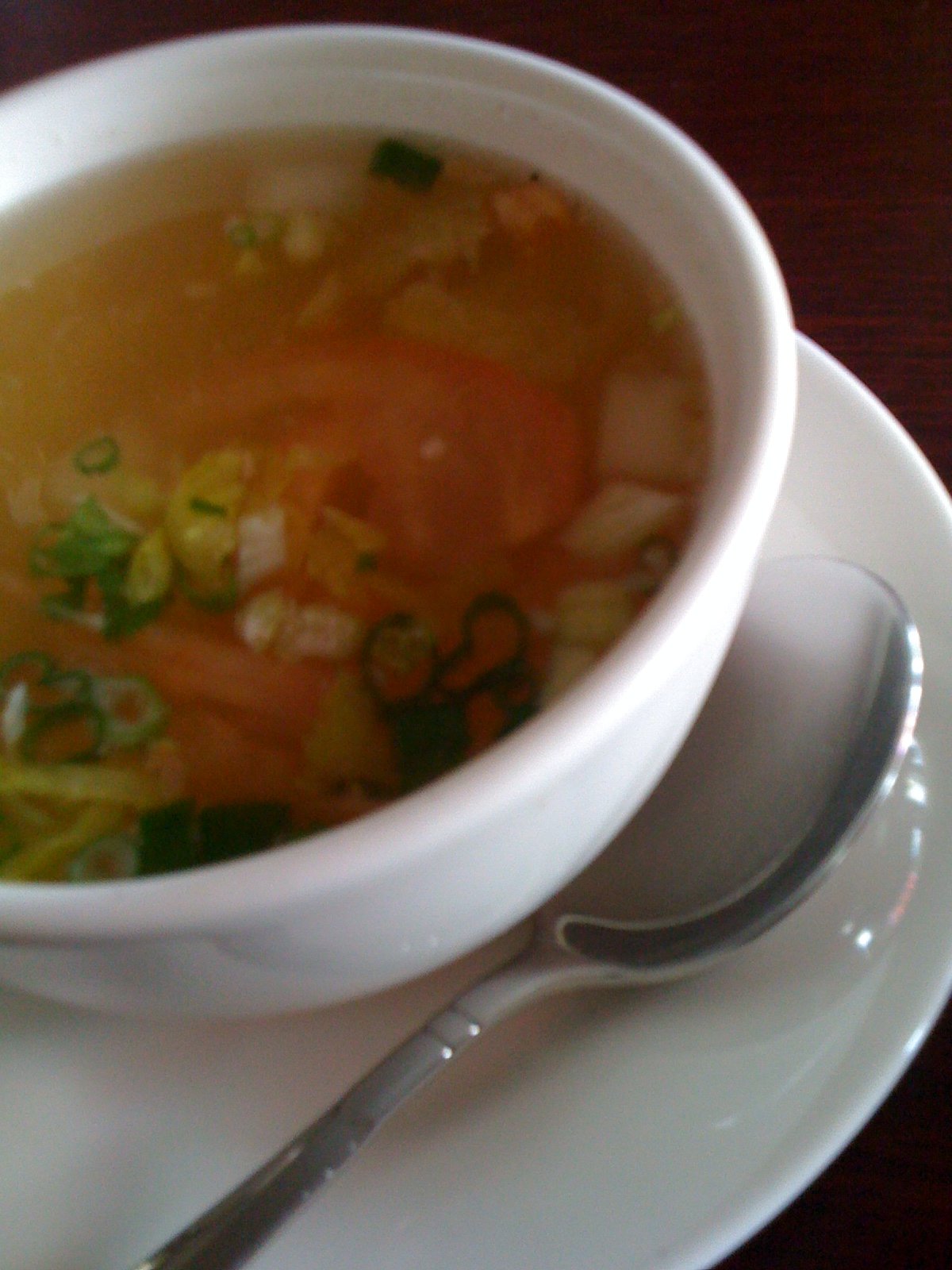 The next time, I went with The Mister for lunch (he has been working late and now seems to also get into work late…) and we each got a bowl of 'egg drop' soup, a chicken based soup broth (very rich) with tomatoes and onions. There was a lemon note to it and the egg part was very fine. It was not spicy, as Tom Yum Gai would be.
