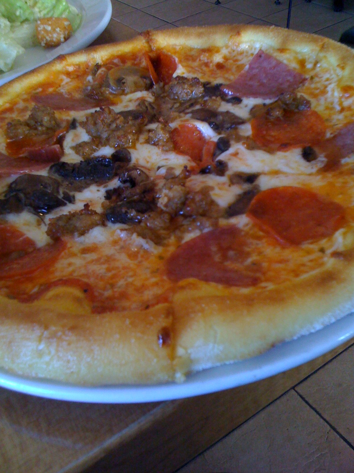 019  Since we could not decide, the "New York" pizza was ordered ($10)- wood fired dough topped with sausage, pepperoni, salami, mushrooms and block olives.  Very good.