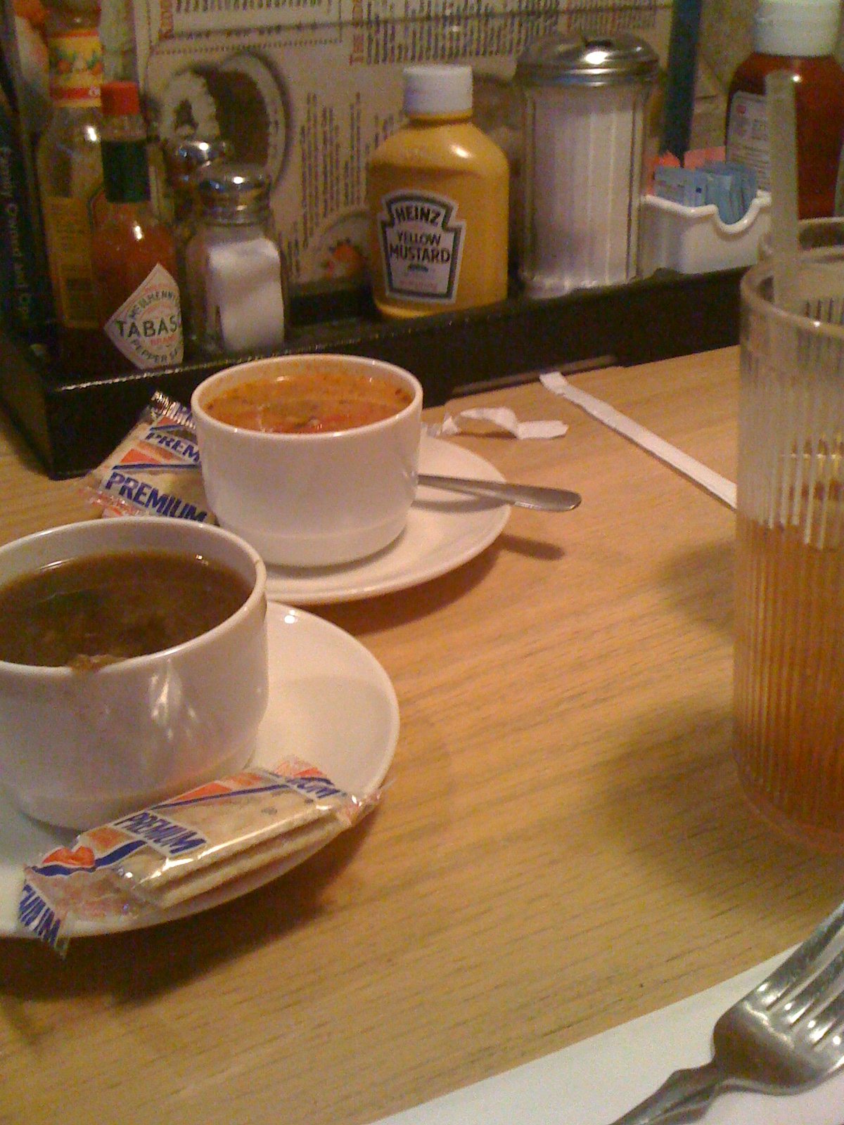 My brother came back from his meetings and was ready for dinner. We went to Blueberry Hill, a 24 hour, Breakfast-Lunch-Dinner place and he ordered one of each of the soups of the day-a tomato turkey and a beef zucchini; both were very good.