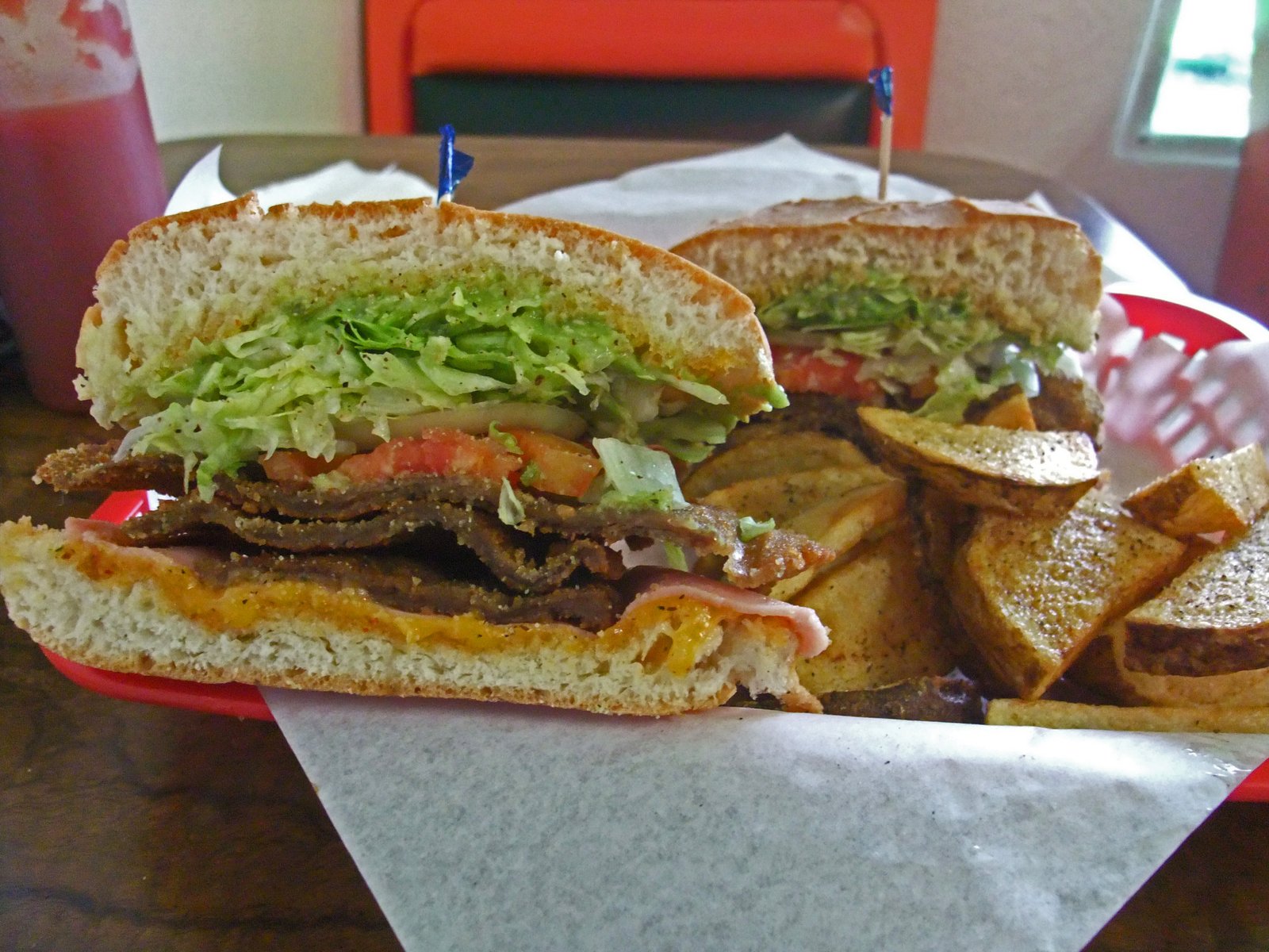 How nice is that? (the packing of more potatoes for you.) And what a sandwich – I’ve not come across a breaded and fried beef fillet sandwich before!