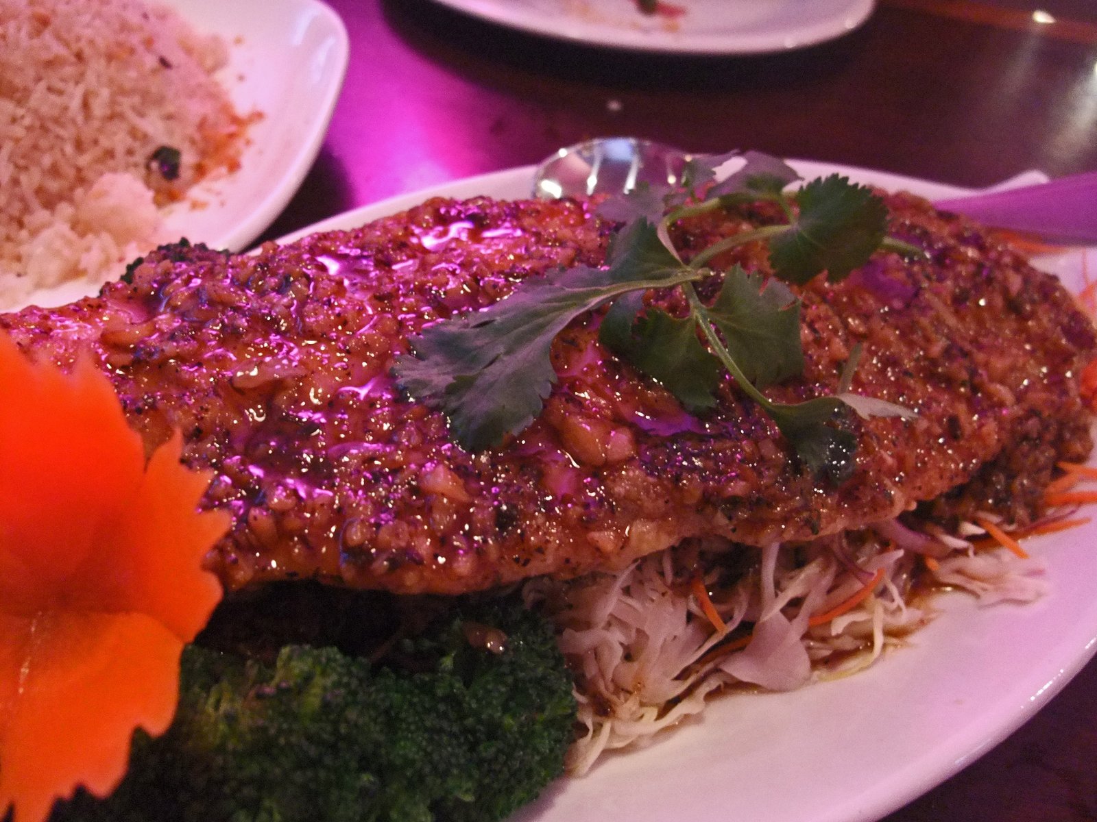 A classic Thai sweet-spicy-garlic preparation. I loved the sauce, and in fact ate up all the cabbage, and even the carrot garnish. Unfortunately for me, the fish used was catfish, and it was a bit muddy for my palate. The Missus joyfully scarfed the whole filet in minutes…….