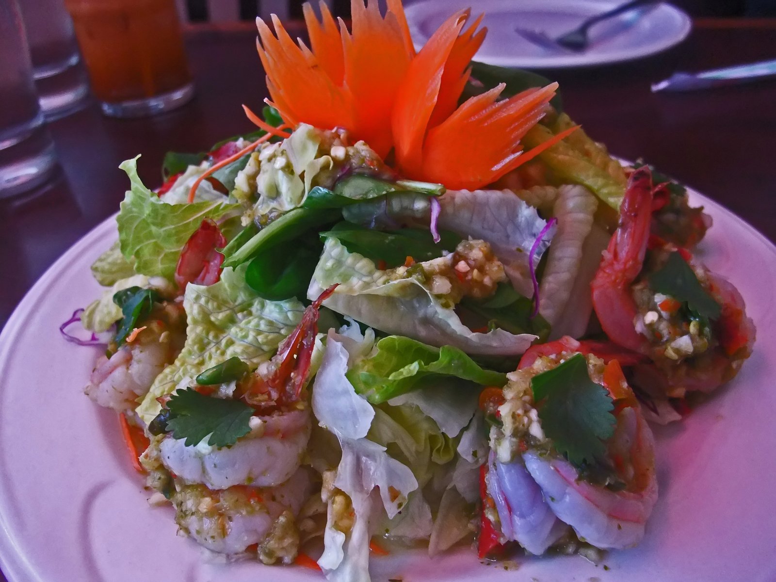 It is dressed with a fish sauce – chili – garlic – palm sugar sauce. Though we prefer the Plaa Shrimp, the shrimp in this dish was cooked to a "just well" doneness.
