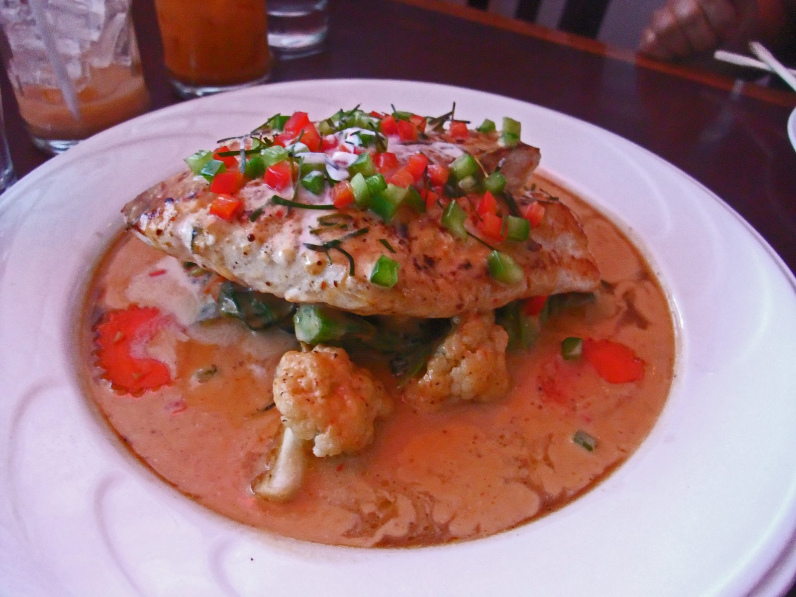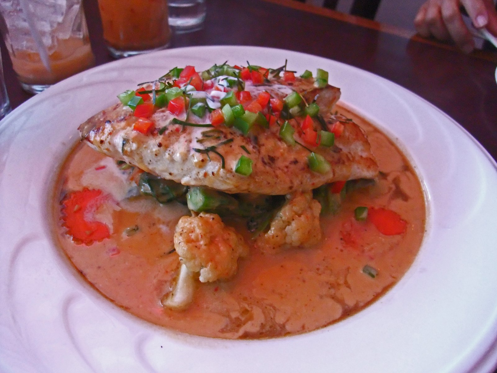 Two large Halibut Filets covered with a red curry sauce and served with a flambe of rum. One quick piece of advice for this dish, let the alcohol burn off before sampling, otherwise the rum adds a rather strong astringent flavor to the dish. The halibut was moist and tender. There was a bit too much going on for me in this dish, but again the Missus loved it.