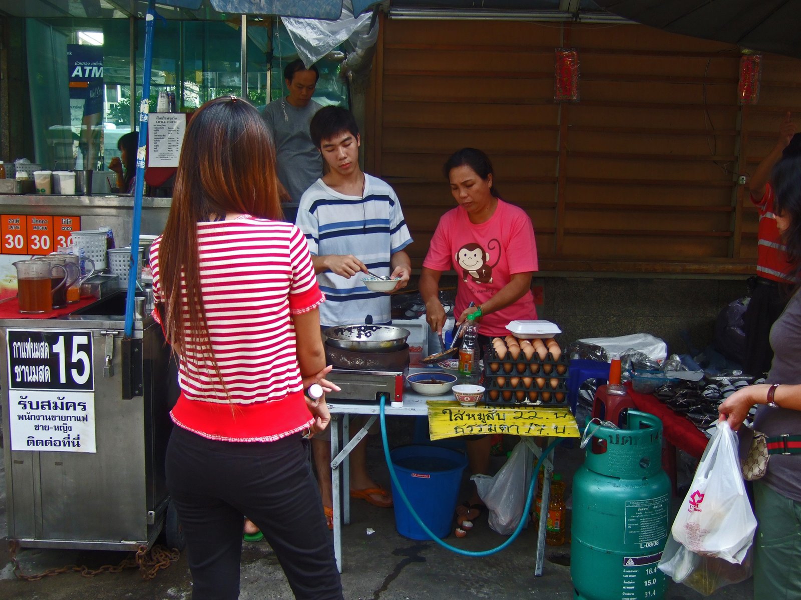 The crazy streets of Silom in Bangkok…….. You know, they say in America, the streets are paved in gold. In Bangkok, the streets are paved in food! Looking at this makeshift food stand, you wouldn't know that it's in front of massive financial buildings in Silom, which is Bangkok's business district.