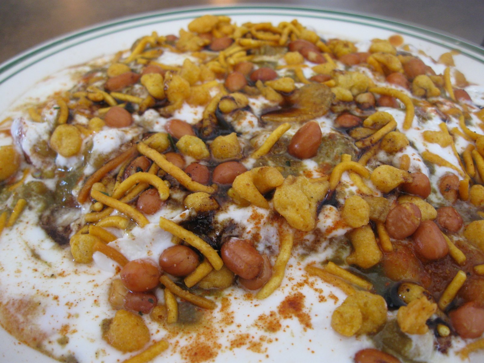Dishes cooked to order are also prepared well. One of my favorites is bhel puri chaat, a fried patty of dough, topped with yogurt, spicy sauce, and more: