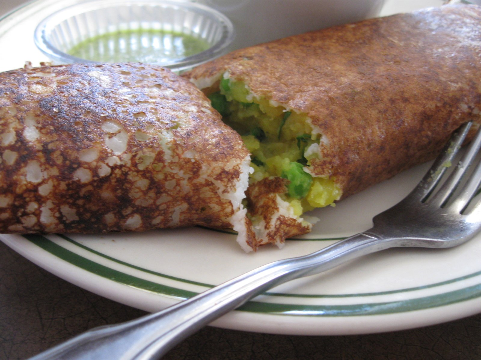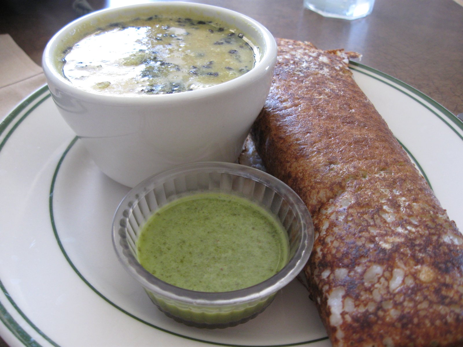 Another time, I tried the masala dosa, a South Indian style pancake rolled around a potato and vegetable filling. It was served with an incredible coconut chutney and a traditional shambher made with yellow daal: