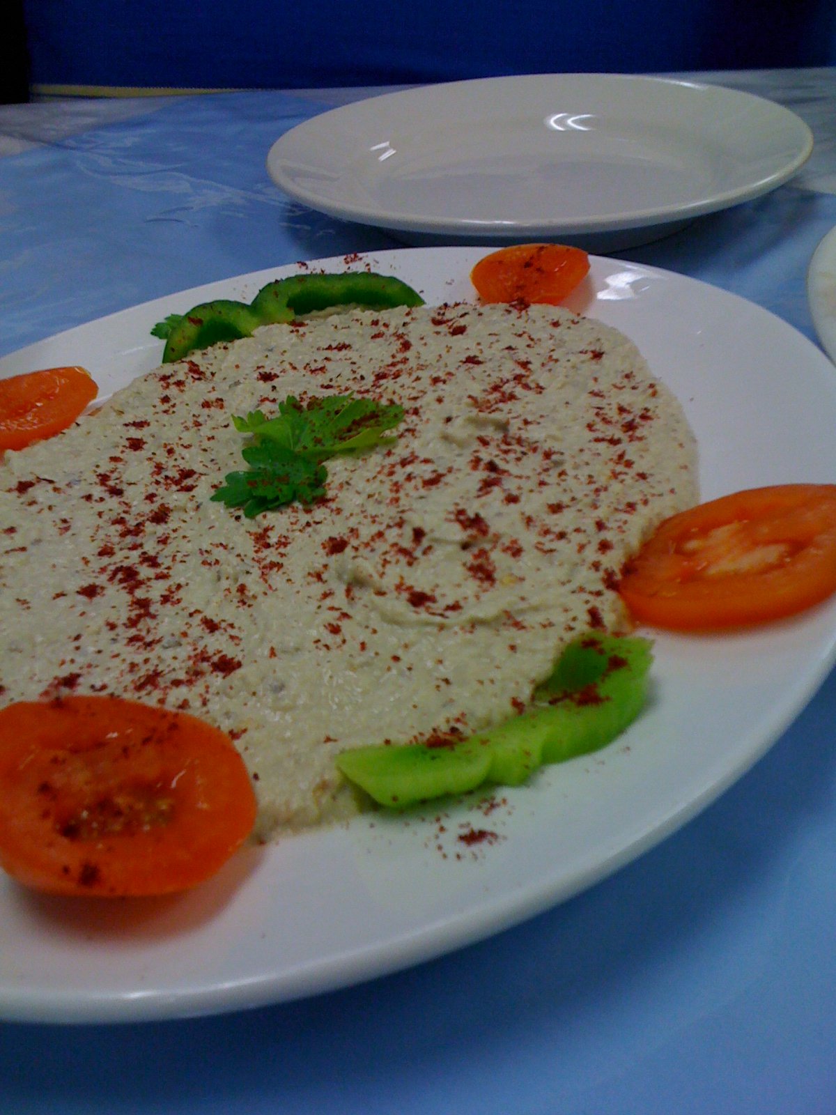 A nice serving of fresh made, creamy baked eggplant, pureed with tahini, garlic and olive oil. Really good. Really fresh. Served with fresh flatbread.