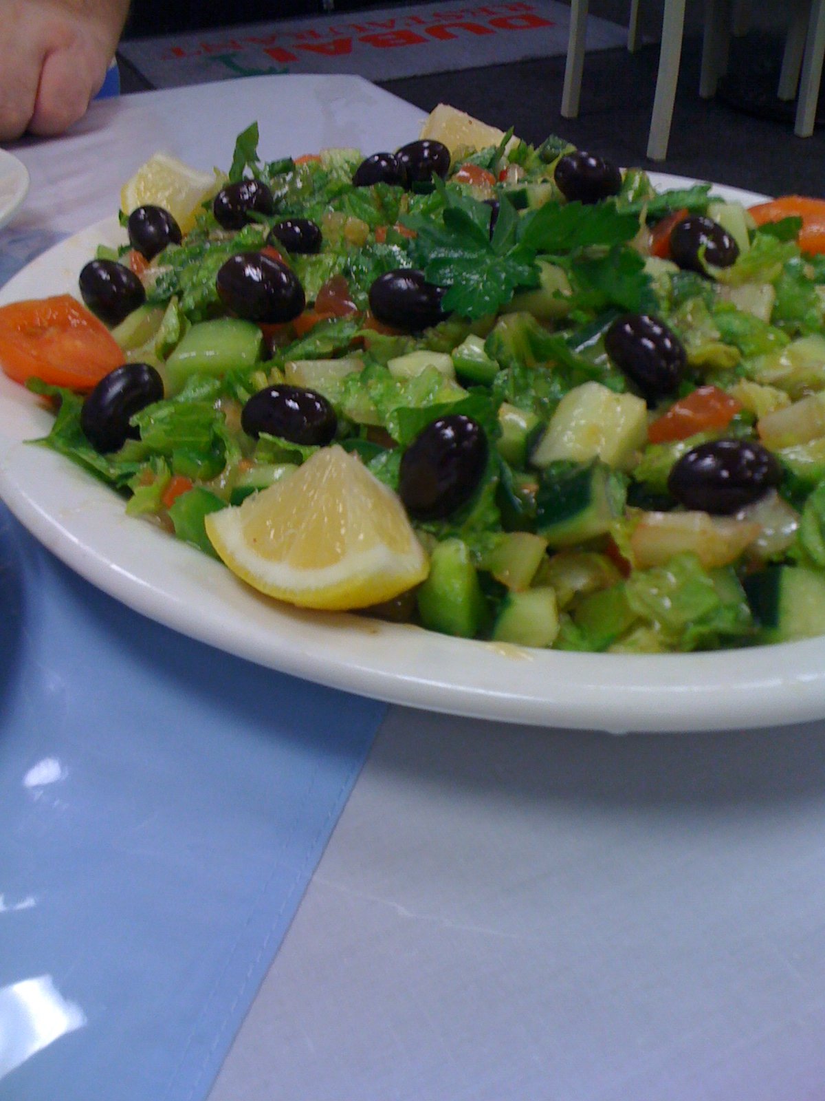 We also ordered the Dubai salad (large, $5.95). Fresh cucumbers, tomatoes, olives and lettuce with a light olive oil and vinegar dressing (vinegar and olive oil are also on the table) and lemon wedges can be added for more flavor. The plate was double the size of the Baba Ghanouj plate.