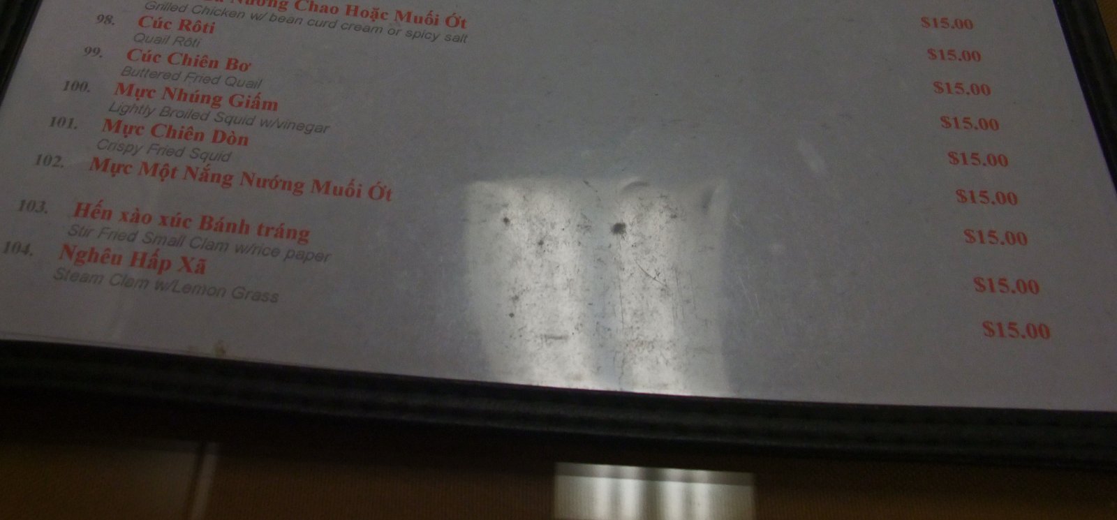 The menu was a different story, as there was a pretty wide range of dishes from the standard Cha Gio at $4.99 to various "Lau" (hot pot) ringing in at $25.