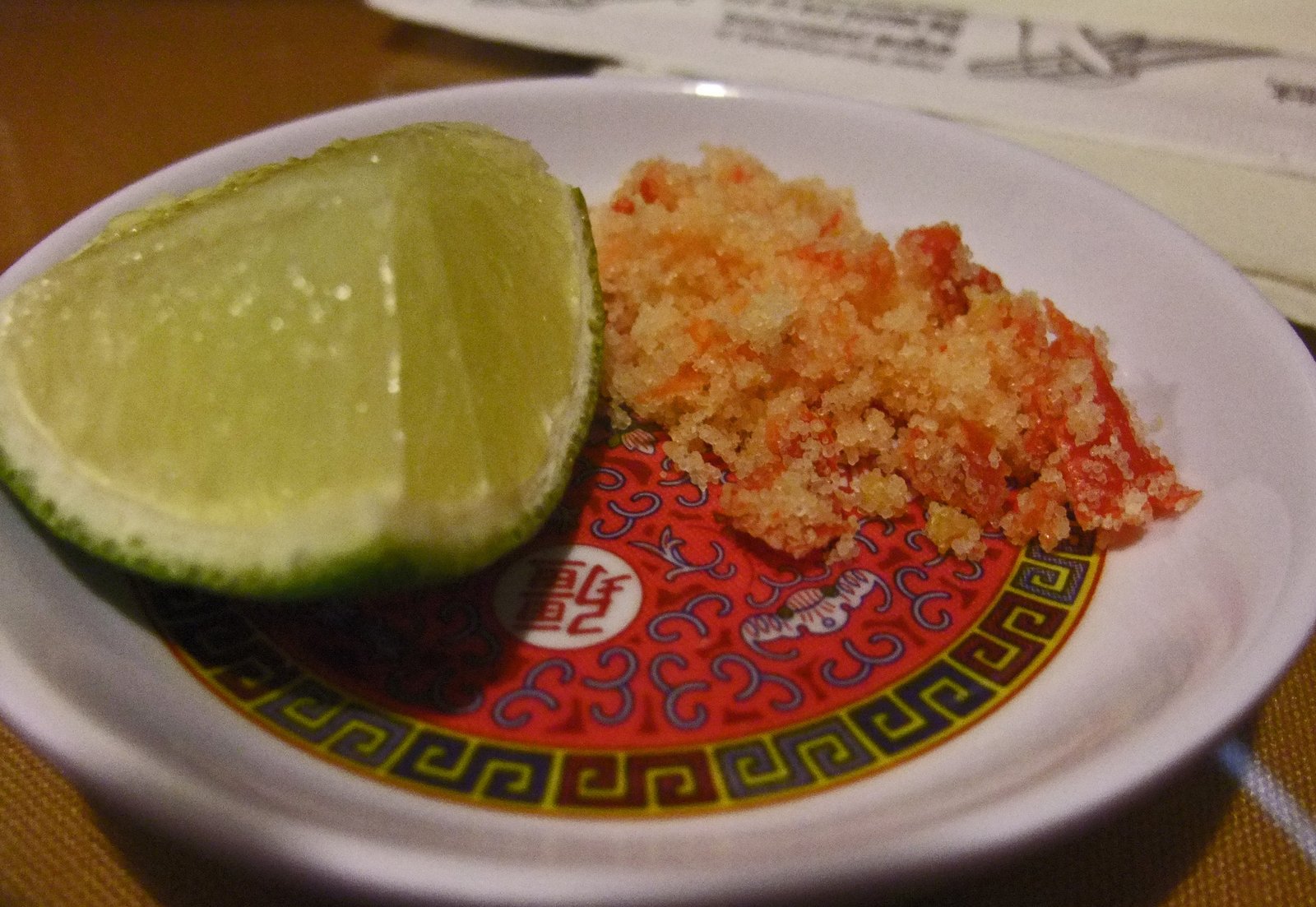 It was not translated into English on the menu, and was simply described to me as #102, the squid dish, Muc Mot Nang Nuong Muoi Ot($15). It was squid grilled with chilies. For some reason, when both the Missus and I were provided with a dish of sea salt mixed with red chilies and a lime wedge, we gad a premonition that this was going to be a good dish. The little plate reminded us of Vietnam.