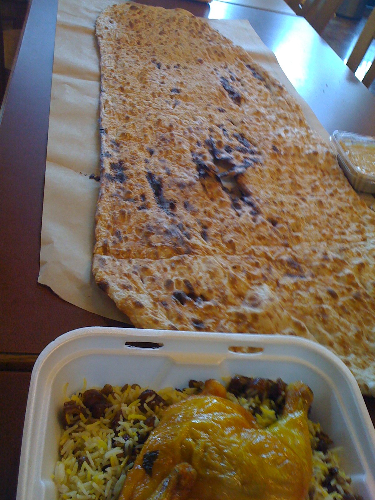 Here is a photo of one large styrofoam tray, filled with half a baked chicken(with *wonderful* saffron flavor) on top of what must be a pound of Addas Polo (basmati and saffron rice with lentils, currants and dates) ($7.99). The rest of the photo is the Sangak bread we picked up when we walked in. At the midpoint of the Sangak bread…see that hummus in a box…one half pound. The box is 4 inches square…wait.