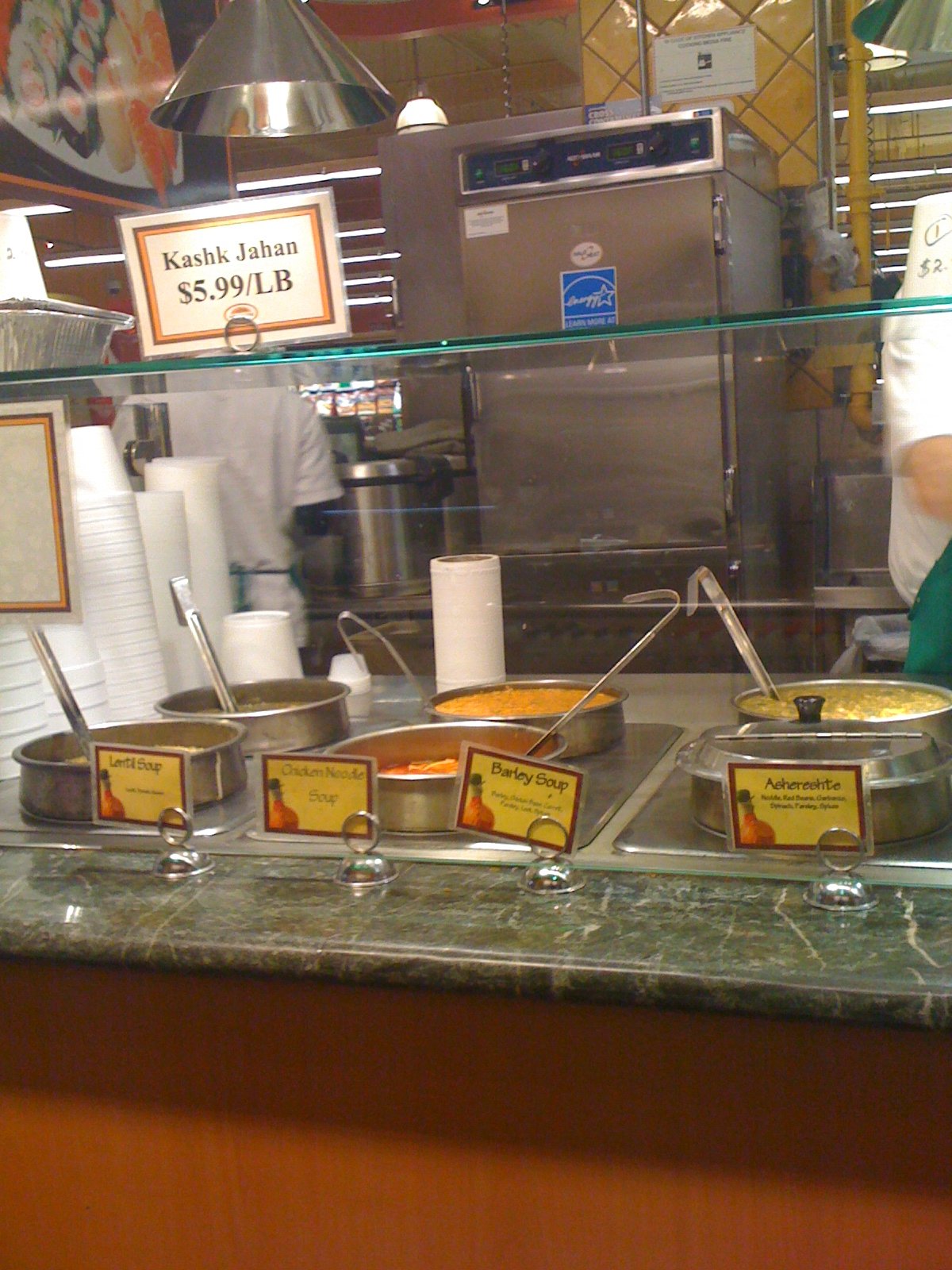 Menus above each area (there are Indian, Persian, Chinese, Thai as well as soups, cold deli and bakery sections )
