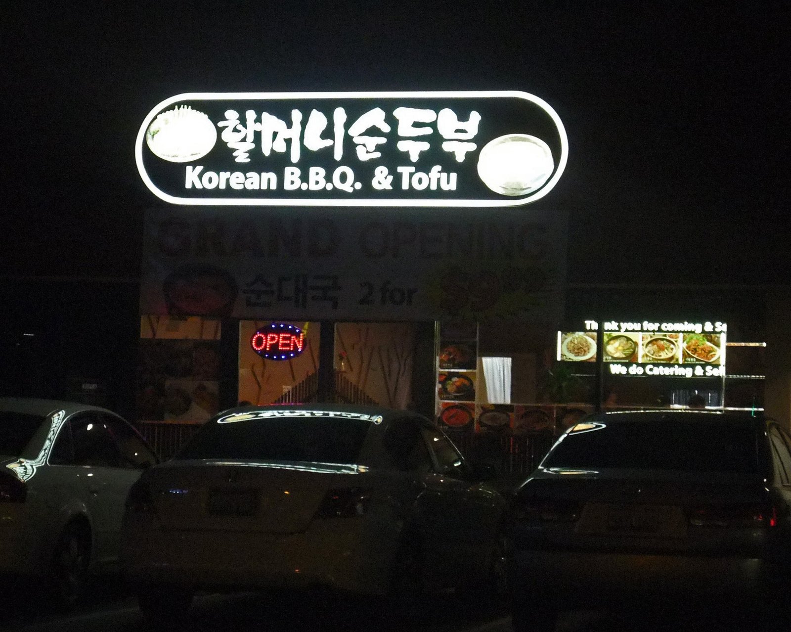 Geez quite a mouthful, huh? Well, the reason for the multiple names is that all the sign says in English is "Korean BBQ & Tofu". In Korean, the name of the place is Hal Mu Ni Soon Tofu….. which leads to the translation…. "할머니" is Grandma in Korean, thus Grandma's Soon Tofu. At least that's what my dining companion MrS told me……