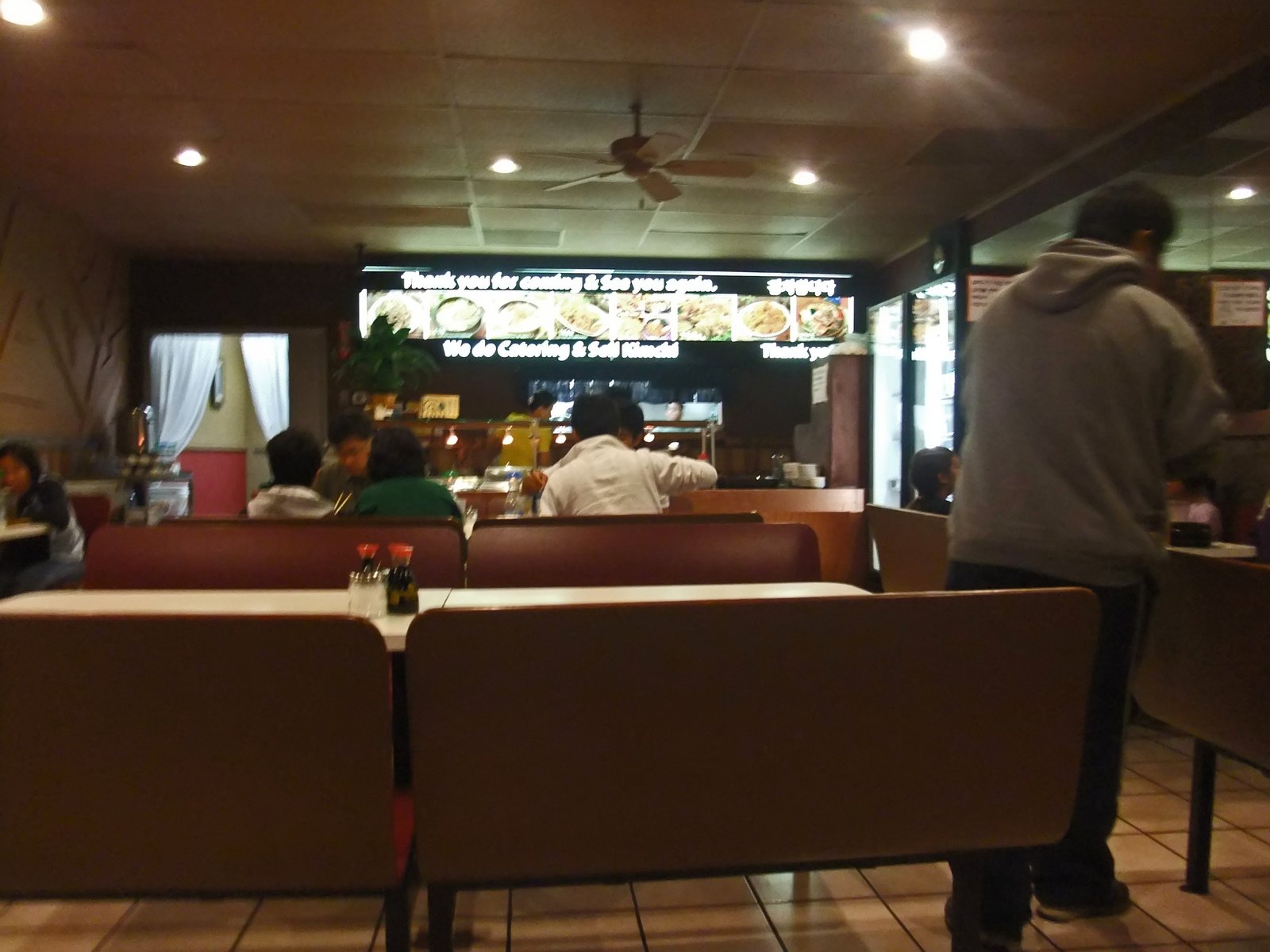 the Korean community in San Diego. Seating is pretty limited, ambiance can appropriately be called "remade fast-food". On our visit, I was the only person not of Korean heritage in the place. Service was efficient and businesslike, and we were offered refills of our panchan. The "grand opening" banner says Soondubu 2 for $9.99. My first impression is that the food is a notch above Chon Ju Jip.