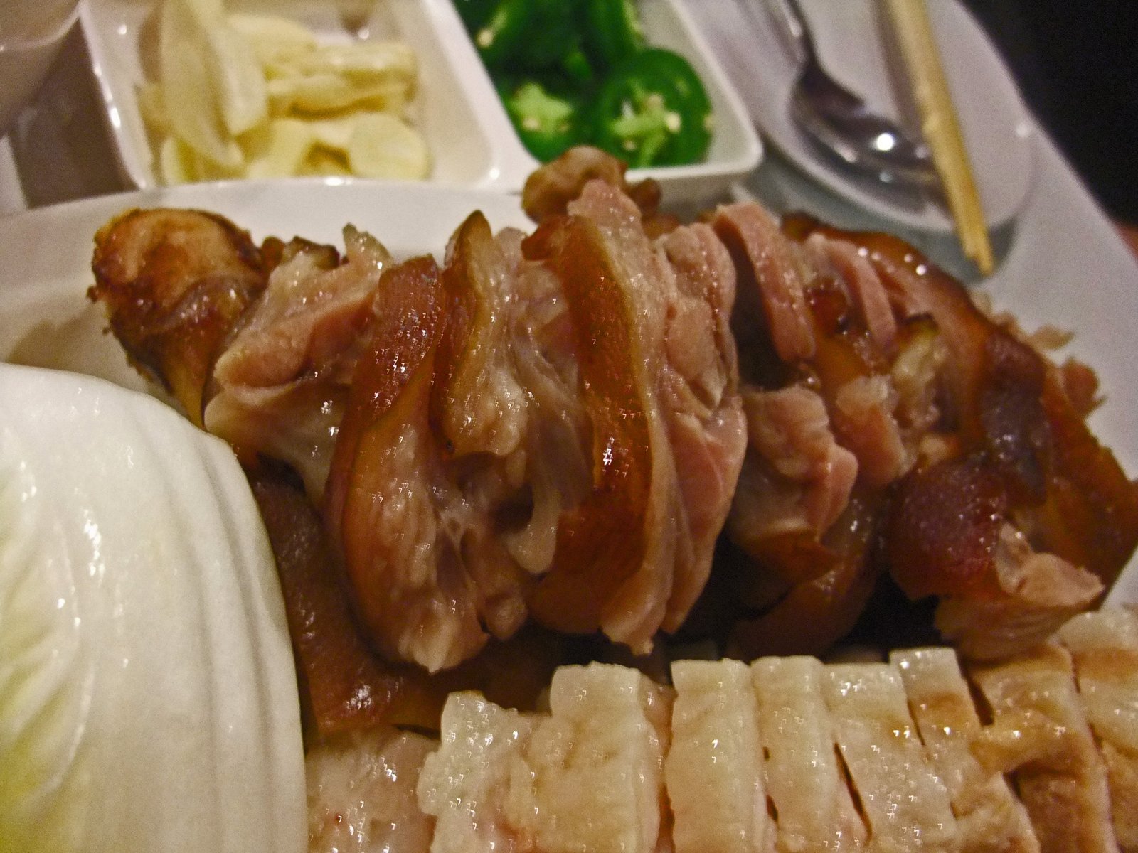 As you can see with the slices of jalapeno and garlic….. I wanted the Gul or Jokbal Bossam….. Mr S found a way to get both, along with Soondae as a "combination bossam" ($21.99):