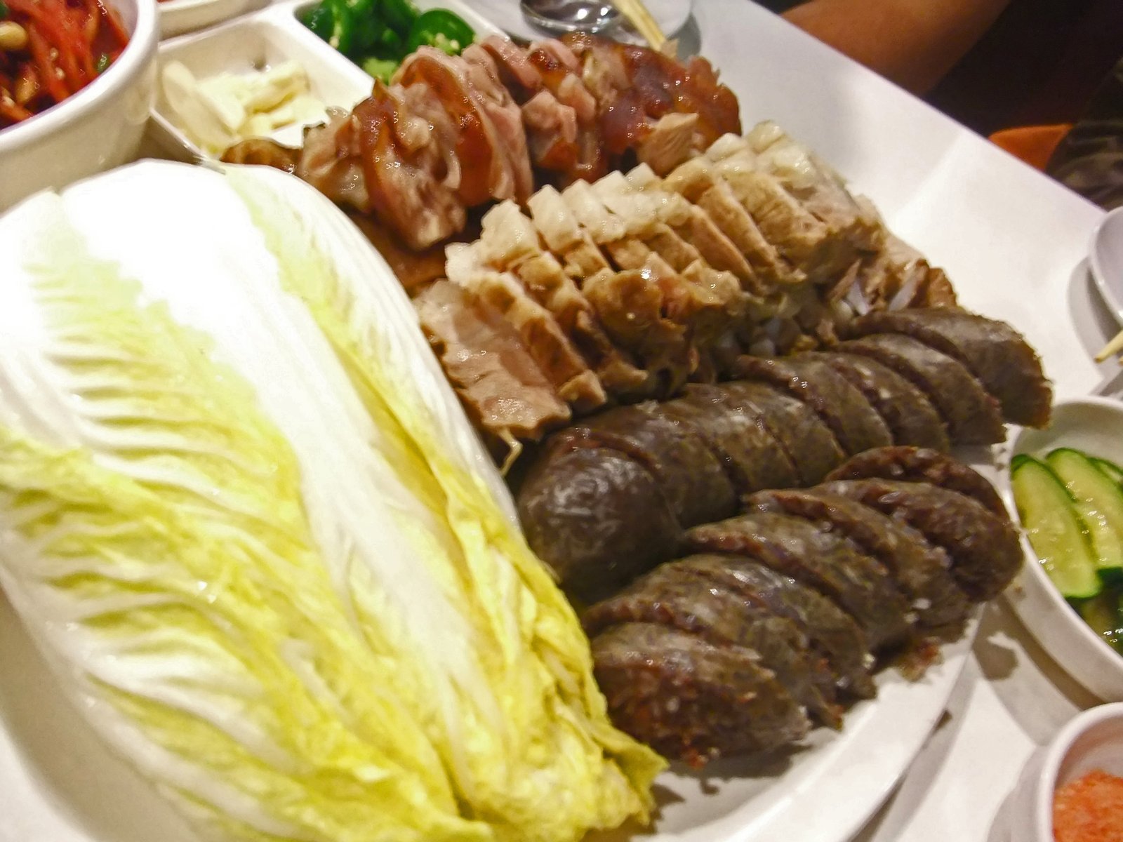 My goodness, this was a lot of food…. there seemed to be half a head of napa cabbage, along with the soondae, gul (steamed pork), and jokbal (pork hock).