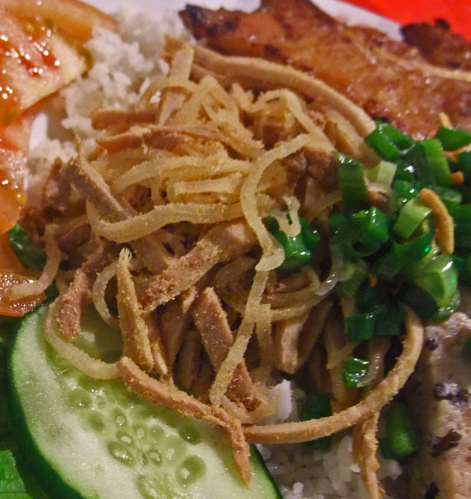 I had recently revisited Phuong Trang, and had the combination Com Tam. I was disappointed in the dish. The broken rice was very fragrant, but everything else, especially the Cha (steamed pork cake) which was dry, cracked, and flavorless. So on another visit I decided to try out the Com Tam Suon Bi Cha (Broken Rice with BBQ Pork Chop, Shredded Pork, and Steamed Egg and Pork):