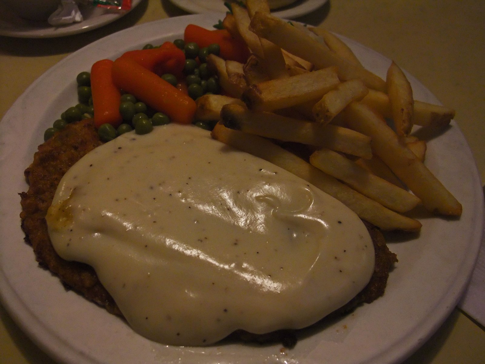 Hi Faye – I dunno, but this was a fairly lousy meal. Some of the blandest chicken fried steak I’ve ever had. It could be that I worked in the South for almost two years, and had some pretty good chicken fried steak with country gravy…..