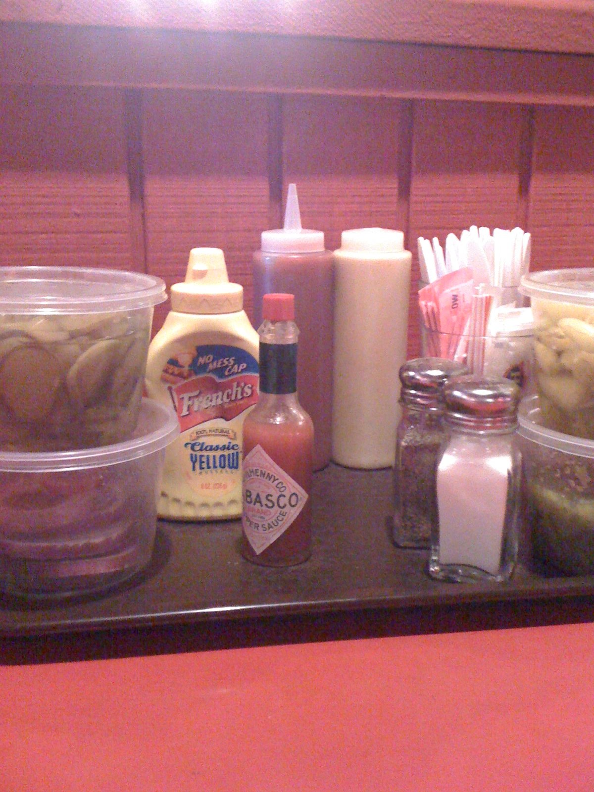 After you place your order, the Traditional Tray of Condiments is brought to your table. -pickles, onions, relish, sweet peppers, catsup, mustard, mustardrelish blend, tobasco, salt and pepper. You still have to remember to ask for mayonnaise.