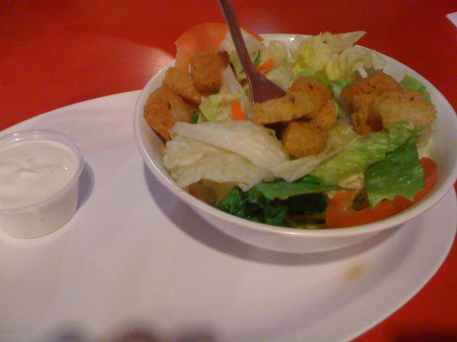 The Mister ordered the 1/2 pound Mushroom-Swiss burger with a side salad ($8.99). Also medium rare. as a combo (with fries (straight or curly), onion rings or salad) it's $8.99 and quite a meal. He likes the fresh sauteed mushrooms and the taste of the Swiss cheese on his burger.
