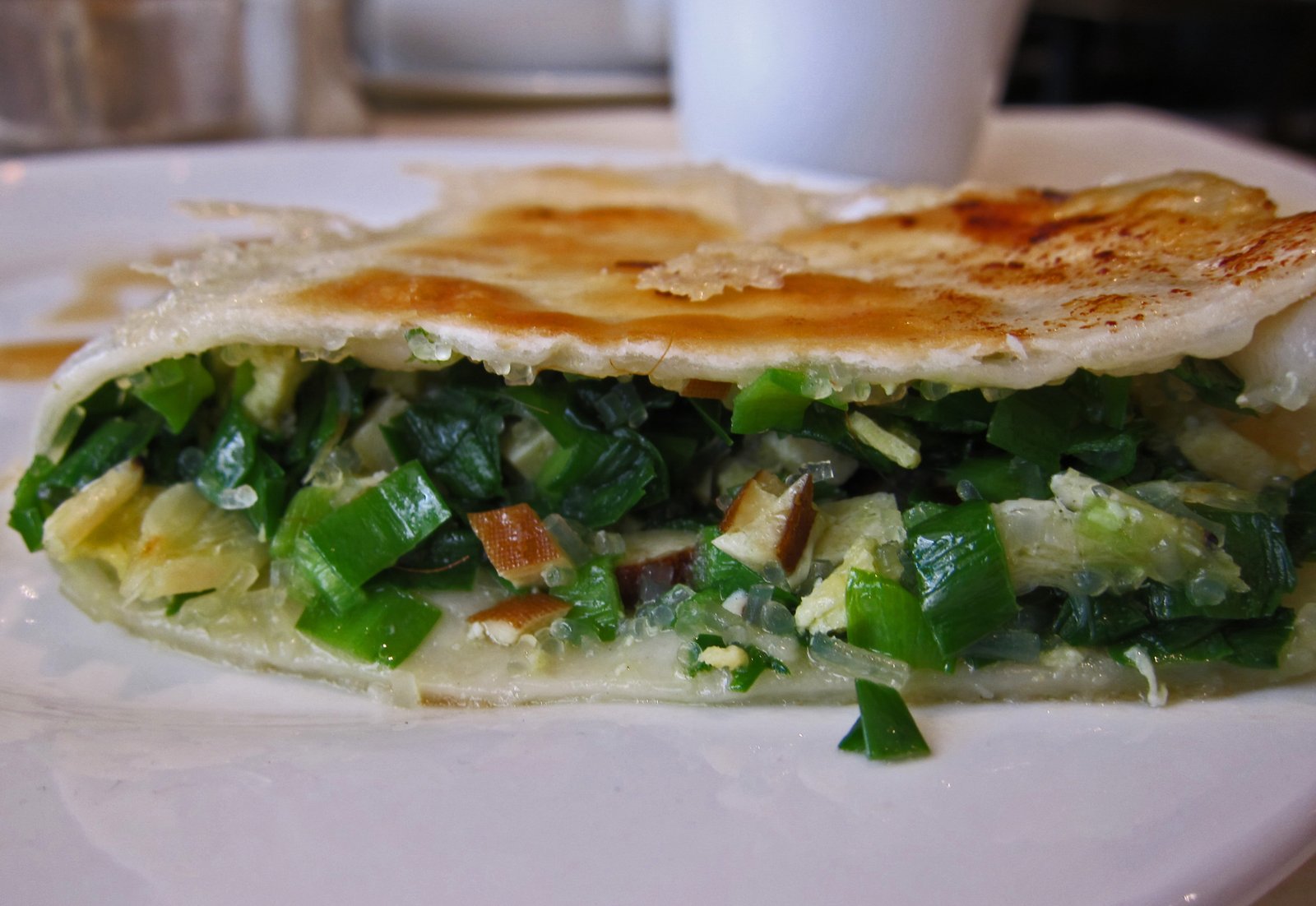 The "pancake" looked almost like Jiang Bing, since it obviously had egg involved. The beef was just the right texture, a nice semi-cured tender without being mushy and falling to pieces, but it seriously lacked flavor…. any flavor. There's usually an additional flavor component, a smear of bean paste, or a hoisin like concoction. This lacked that, which meant that the pungency of the scallions took over.