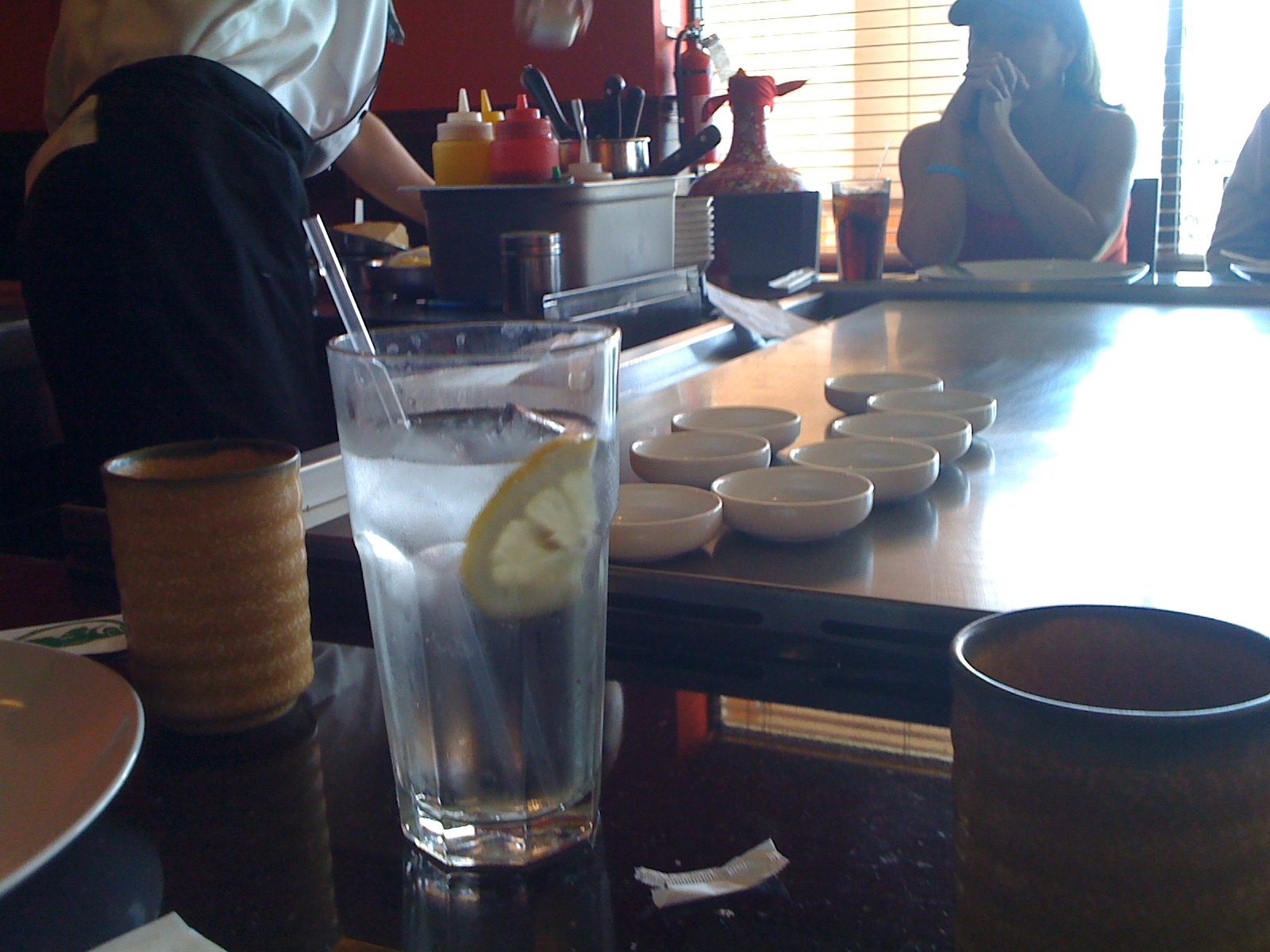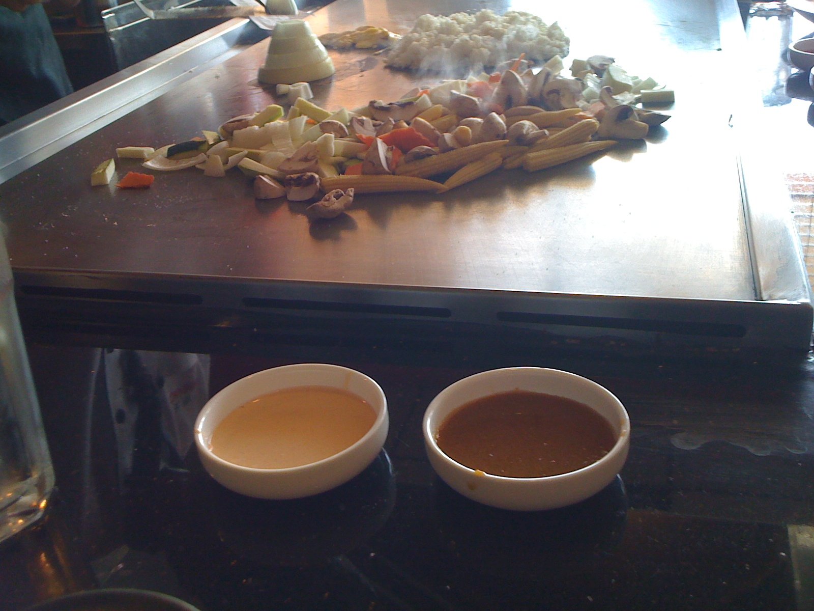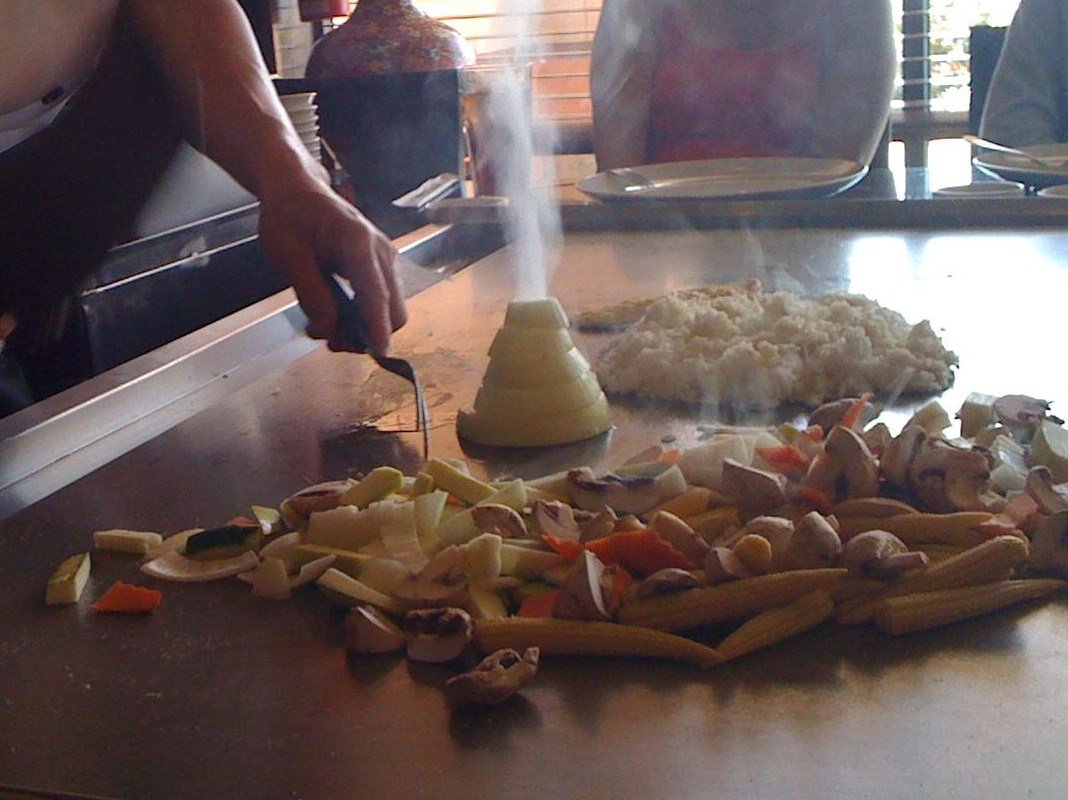 Rice, for those who had ordered fried rice, and already chopped vegetables for everyone were placed onto the oiled grill. (When The Mister and I got married, XXX number of years ago, our reception was at Kyoto, a teppanyaki restaurant in Dearborn, Michigan and everything was the same, except the veggies there came whole and the "show" took a lot longer to chop up everything…and the prices at lunch were a less…probably because it was XXX years ago).