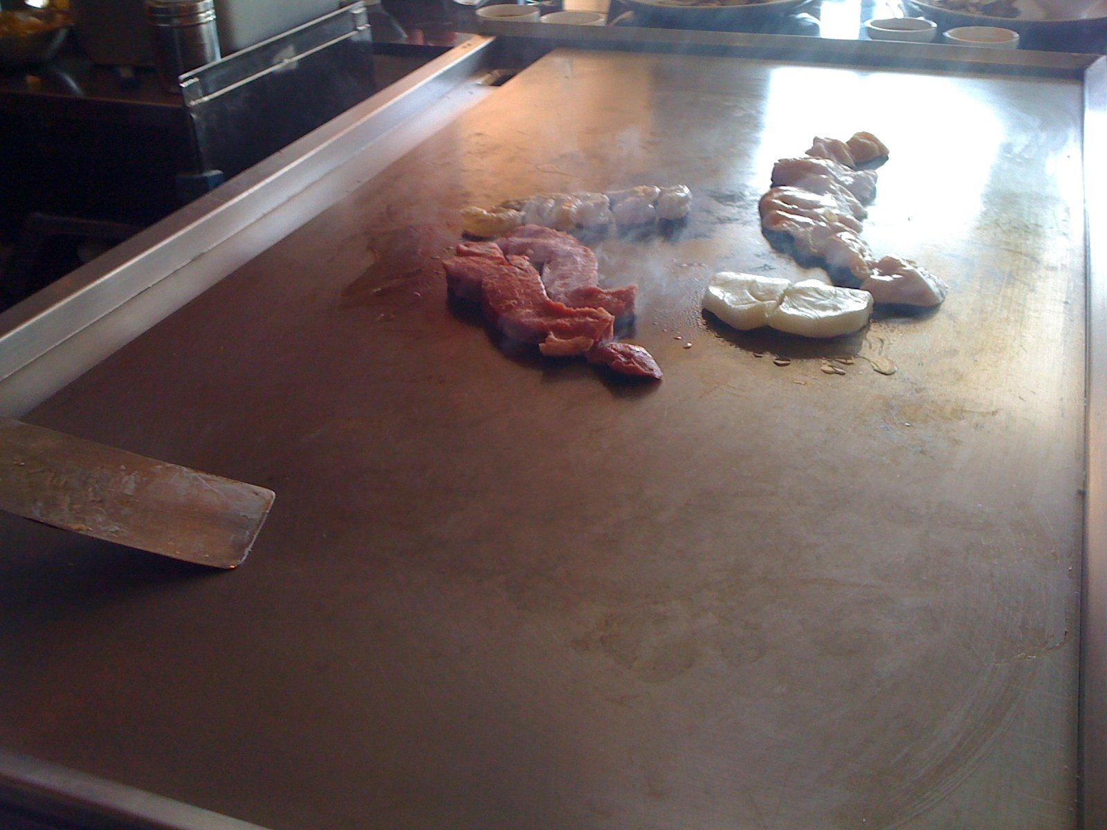 The proteins were placed onto the grill (two orders of Banzai chicken, a split order of Samurai steak and Hibachi shrimp-you can combine on the lunch specials), Samurai steak, and Chilean sea bass.
