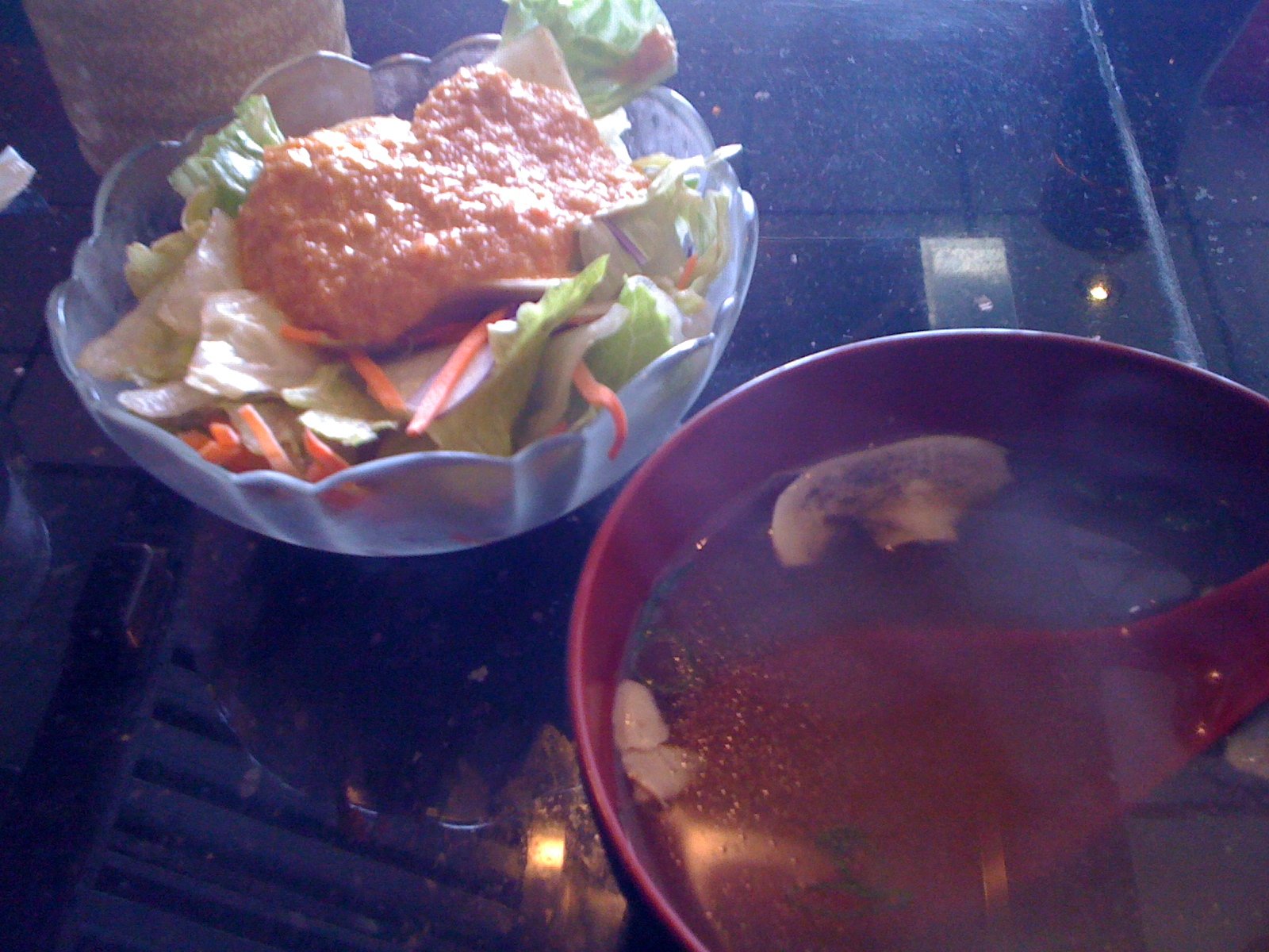 We ordered, and soon salad and mushroom topped miso soup were brought out. The miso was definitely not made from that miso paste or powder and had a light, crisp flavor. The mushroom flavor was only in the mushroom, not the broth. The salad dressing was the fresh tasting almost pureed ginger dressing which is served at most Japanese places. This one seemed to have a touch of soy/saltiness to it. (In a good way saltiness). Soon our chef came out with a cart of enough rice for frying, vegetables for all six of us, and the proteins ordered as well as the sauces and other condiments necessary for each protein.