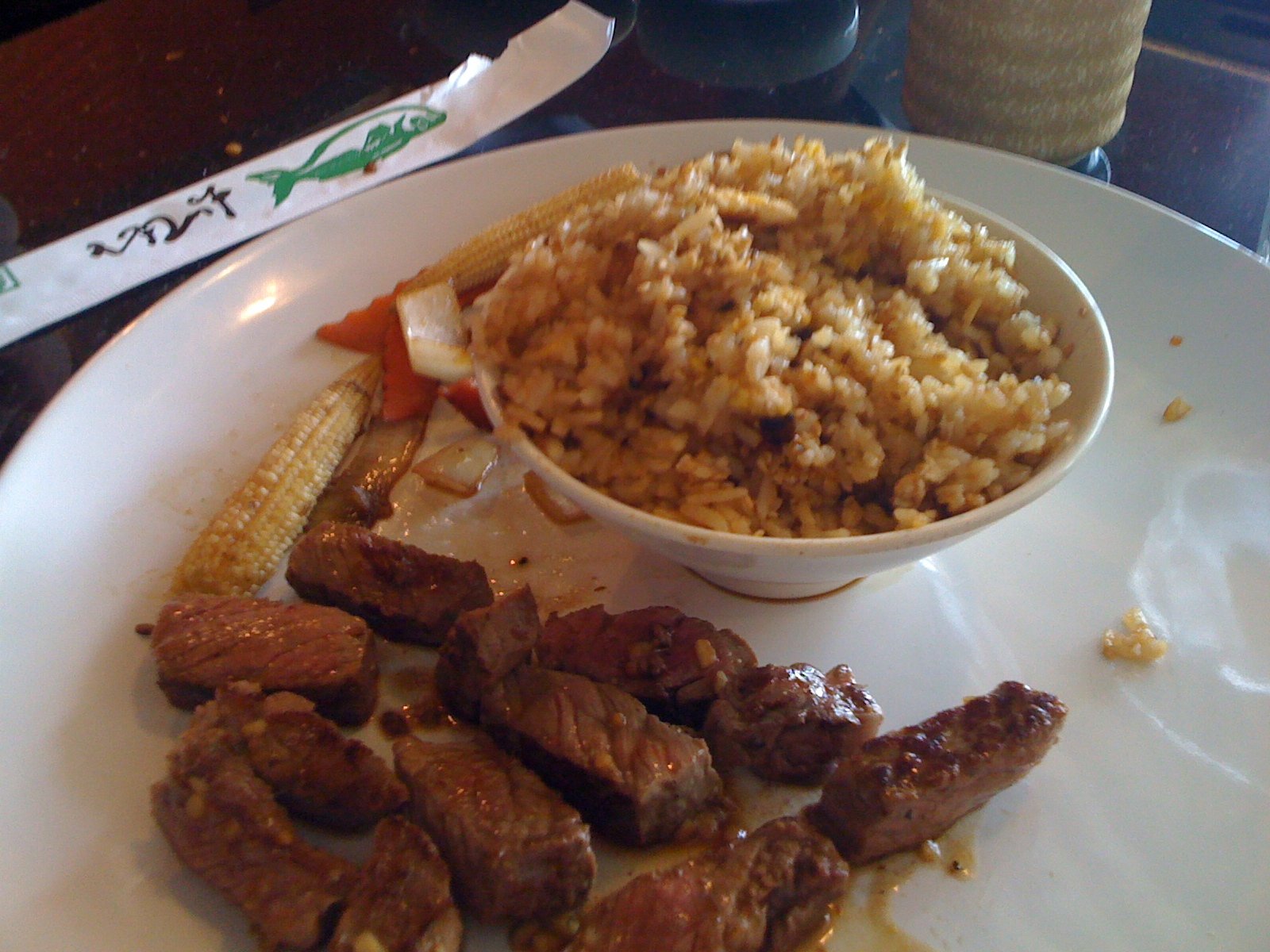 The Mister's order of Samurai steak (medium rare), fried rice ($1.95 extra, but *so* crisp and tasty-a nutty flavor, probably because of the sesame oil…and butter) and some of his vegetables ($10.95).