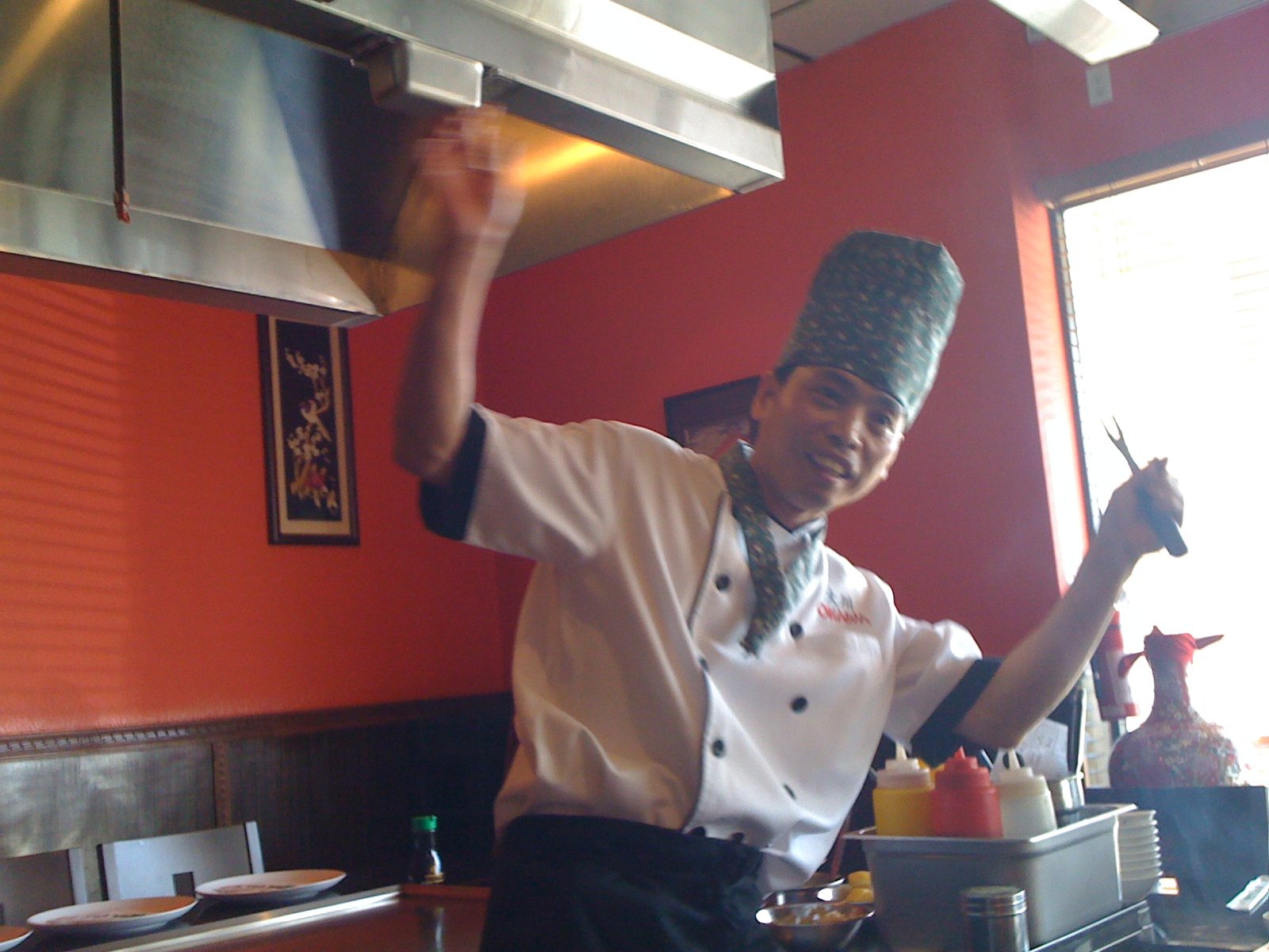 The rice was fried, with an egg, (which disappeared, whole, into the hat of the chef for a while) and then the crispier rice and veggies formed to spell out "I (heart) U"…upside down and backwards… and then those were served.