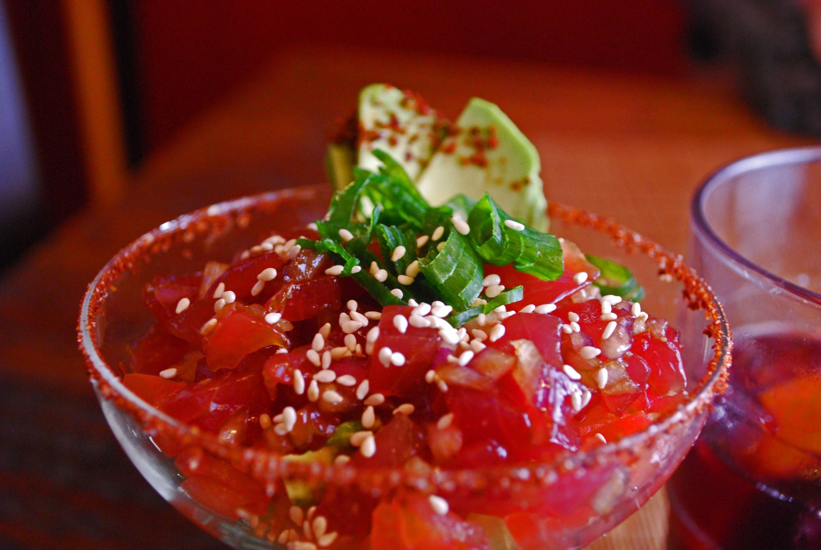 We liked the maguro we saw at Marukai, and picked up a block, and of course much like my previous post on Maguro Tartar, the Missus wanted something a bit different. So with all the same ingredients, I came up with two more appetizers. You can see my recipe in this post. I built the dishes after getting all my mise together, and built the first one before mixing in the cucumber, tomato, and avocado into the tartar. I grabbed a really old, and kinda tacky glass and built it up layer by layer. A dab of wasabi paste was spread on the bottom, followed by cucumber, tomato, avocado, followed by the maguro mixture.