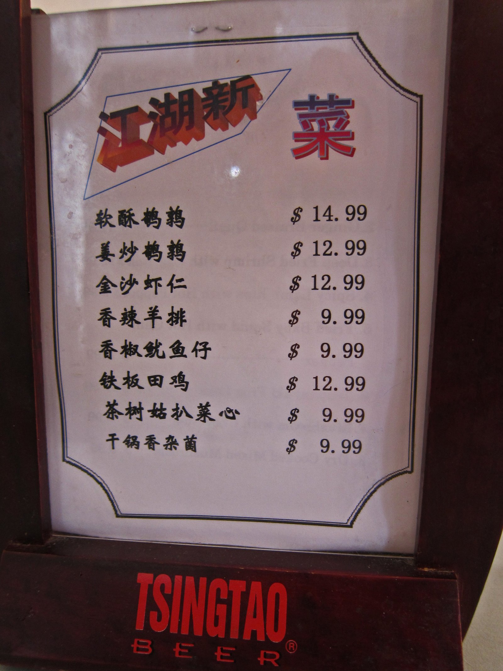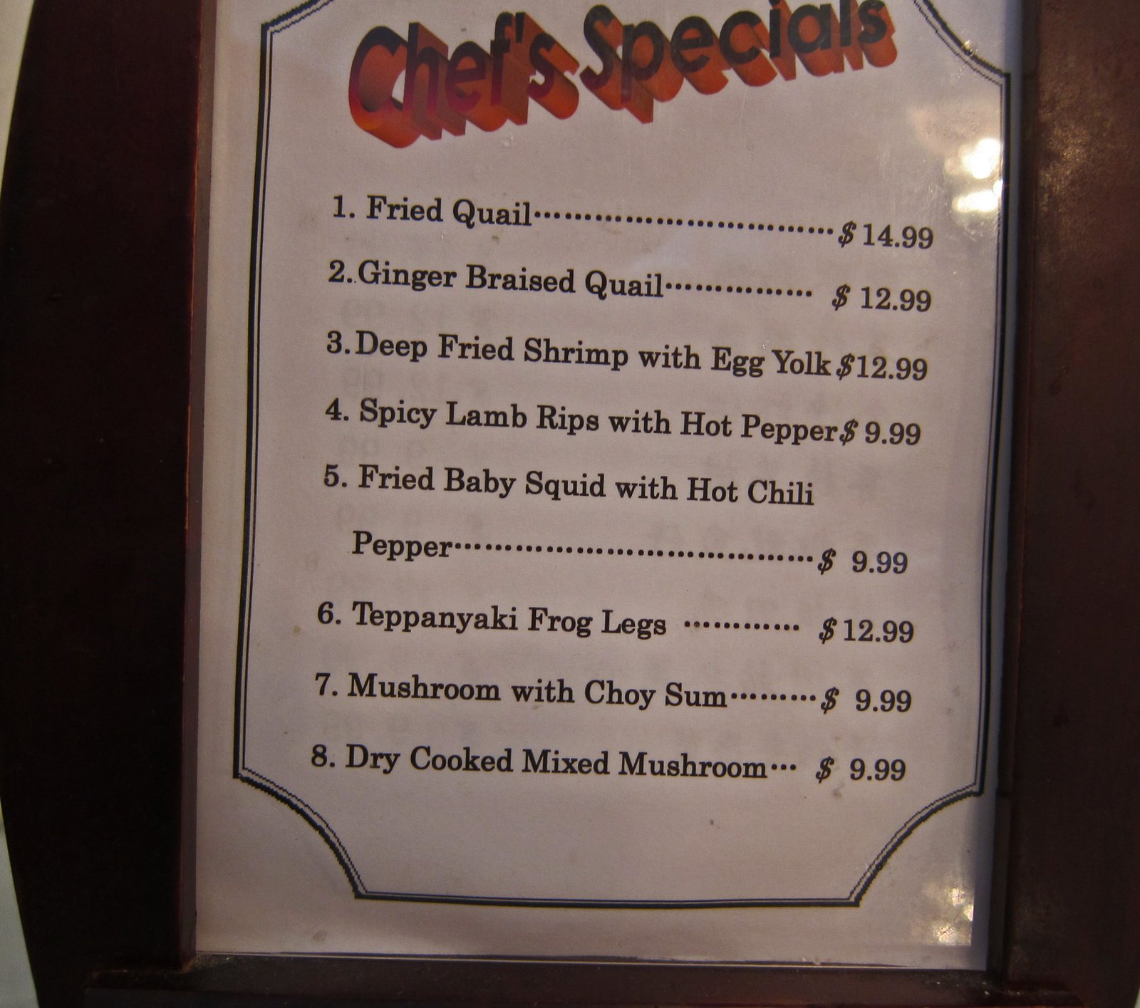 Two of the items, the Lamb Ribs and the Dry Cooked Mushrooms are holdovers. I've been unsuccessful in getting the Missus to agree to order the Frog Legs.