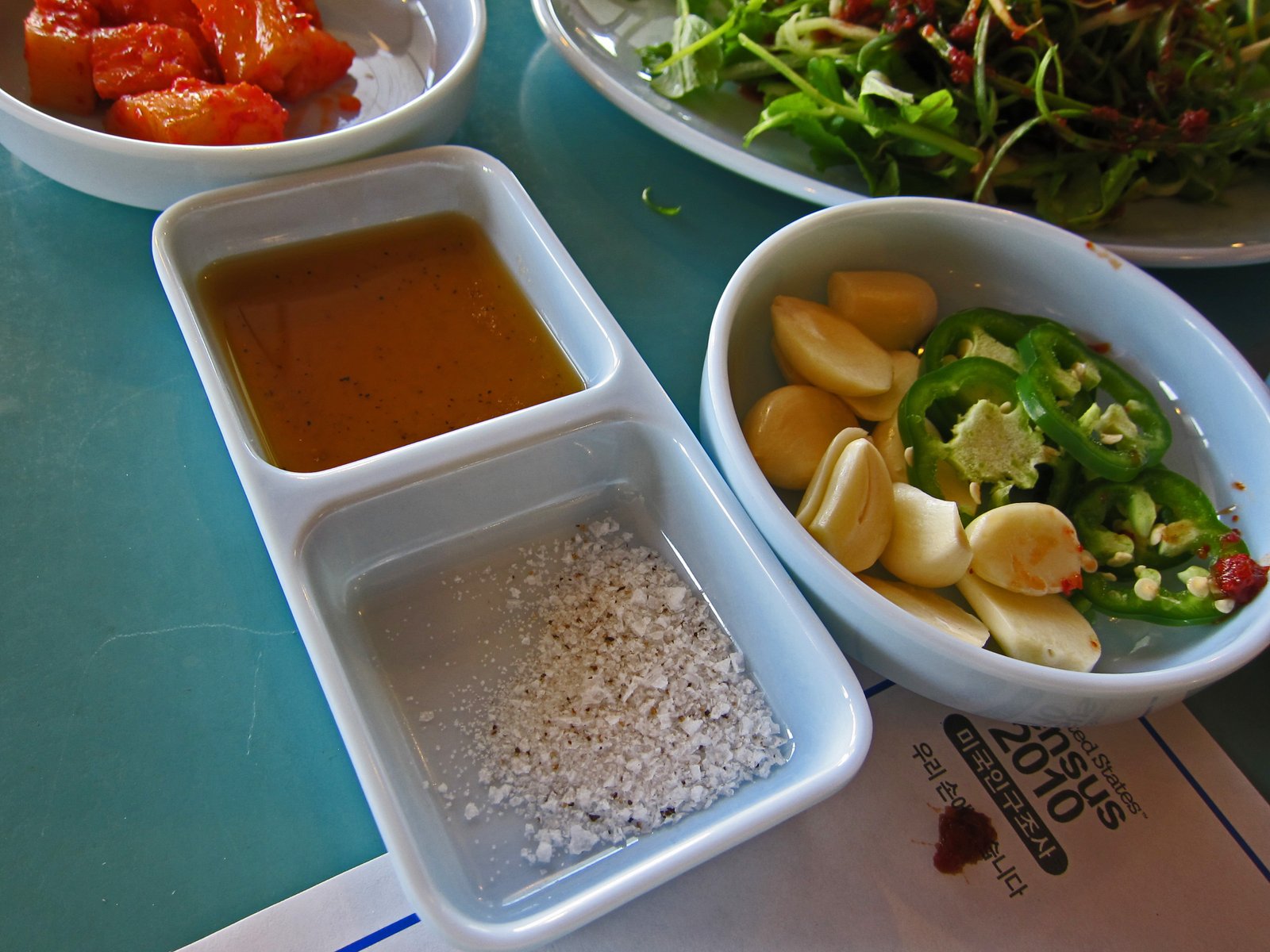 You could tell by what was brought out that this was a "Bossam" style Korean BBQ, as rice paper sheets and thin slices of radish, along with some really great tasting greens were quickly provided. In other words, you'll be wrapping your BBQ with rice paper and radish. Sesame Oil and Salt, along with raw garlic and sliced jalapenos were also provided.