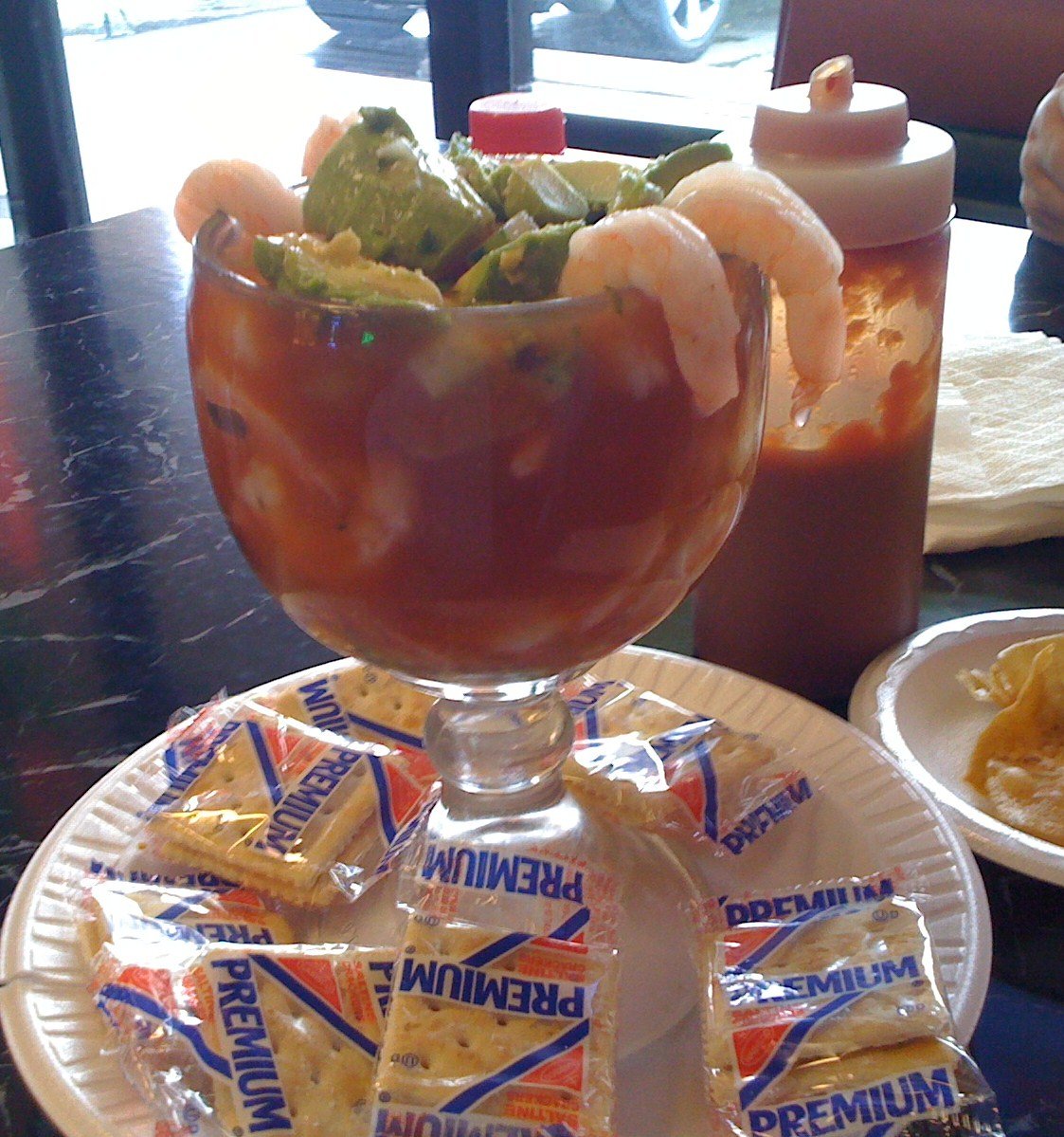 When ordering, I decided to contrast the warm and meat with cool and seafood, so a shrimp coctele ($9.99) was in order. There were 30 shrimp in this large serving glass, with lime and tomato juice, cucumber and some onion. The fresh flavors of this 'broth' as well as the pretty large flavorful shrimp were a nice contrast and compliment to the fatty rich soup broth. It was a nice break for both of us. But I had to drive home in this…